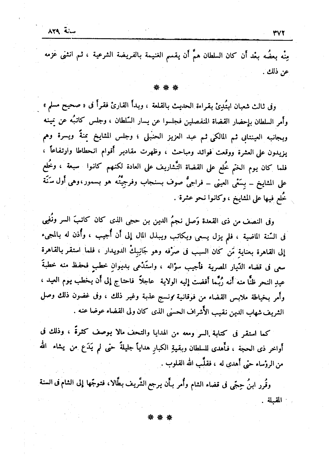 وفي النصف من ذي القعدة وصل نجم الدين ابن حجي الذي كان كاتب السر وبقي في السنة الماضية فلم يزل يسعى ويكاتب يبذل المال إلى أن أجيب وأذن له بالمجيء إلى القاهرة بعناية من كان السبب في صرفه وهو جانبك الدويدار، فلما استقر بالقاهرة سعى في قضاء الديار المصرية، فأجيب سؤاله واستدعى بديوان خطب فحفظ منه خطبة عيد النحر ظناً منه أنه ربما أفضت إليه الولاية عاجلاً فاحتاج إلى أن يخطب يوم العيد، وأمر بخياطة ملابس القضاة من فوقانية ونسج عذبة وغير ذلك، ففي غضون ذلك وصل الشريف شهاب الدين نقيب الأشراف الحسيني الذي كان ولى القضاء عوضا عنه لما أسفر في كتابة السر ومعه من الهدايا والتحف ما لا يوصف كثرة وذلك في أواخر ذي الحجة، فأهدى للسلطان وبقية الكبار هدايا خليلة حتى لم يدع من شاء الله من الرؤساء حتى أهدى له فقلب الله القلوب، وقرر ابن حجى في قضاء الشام وأمر بأن يرجع الشريف بطالا، فتوجها إلى الشام في السنة المقبلة.