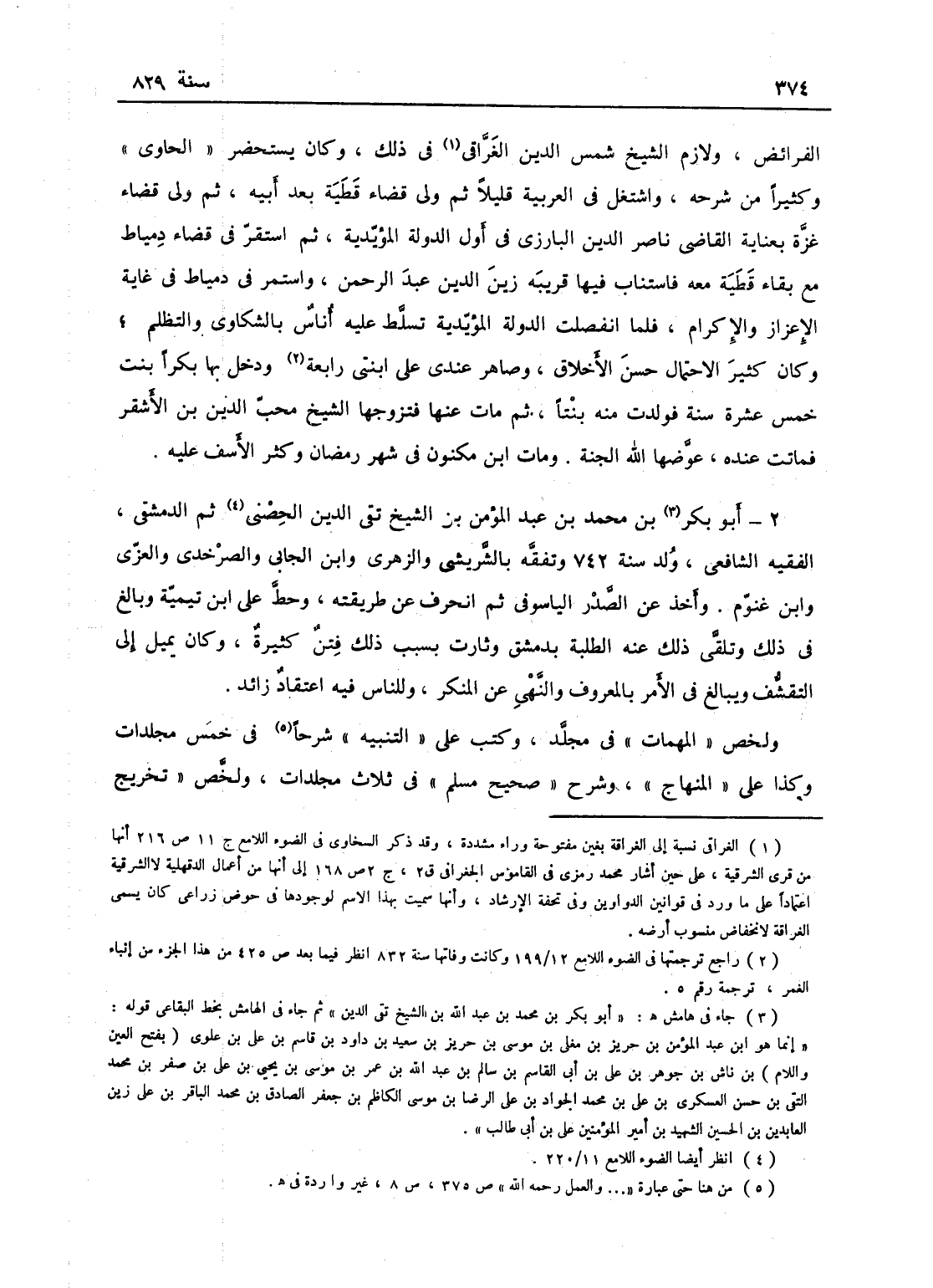 اينال النوروزي أمير سلاح مات في أول ربيع الآخر بالقاهرة. أبو بكر بن محمد بن عبد الله الشيخ تقي الدين الحصني ثم الدمشقي الفقيه الشافعي، ولد سنة 752، وتفقه بالشريشي والزهري وابن الجابي والصرخدي والغزي وابن غنوم، وأخذ عن الصدر الياسوفي ثم انحرف عن طريقته، وحط على ابن تيمية وبالغ في ذلك، وتلقى ذلك عنه الطلبة بدمشق، وثارت بسبب ذلك فتن كثيرة، وكان يميل إلى التقشف، ويبالغ في الأمر بالمعروف والنهي عن المنكر، وللناس فيه اعتقاد زائد، ولخص المهمات في مجلد، وكتب على التنبيه،