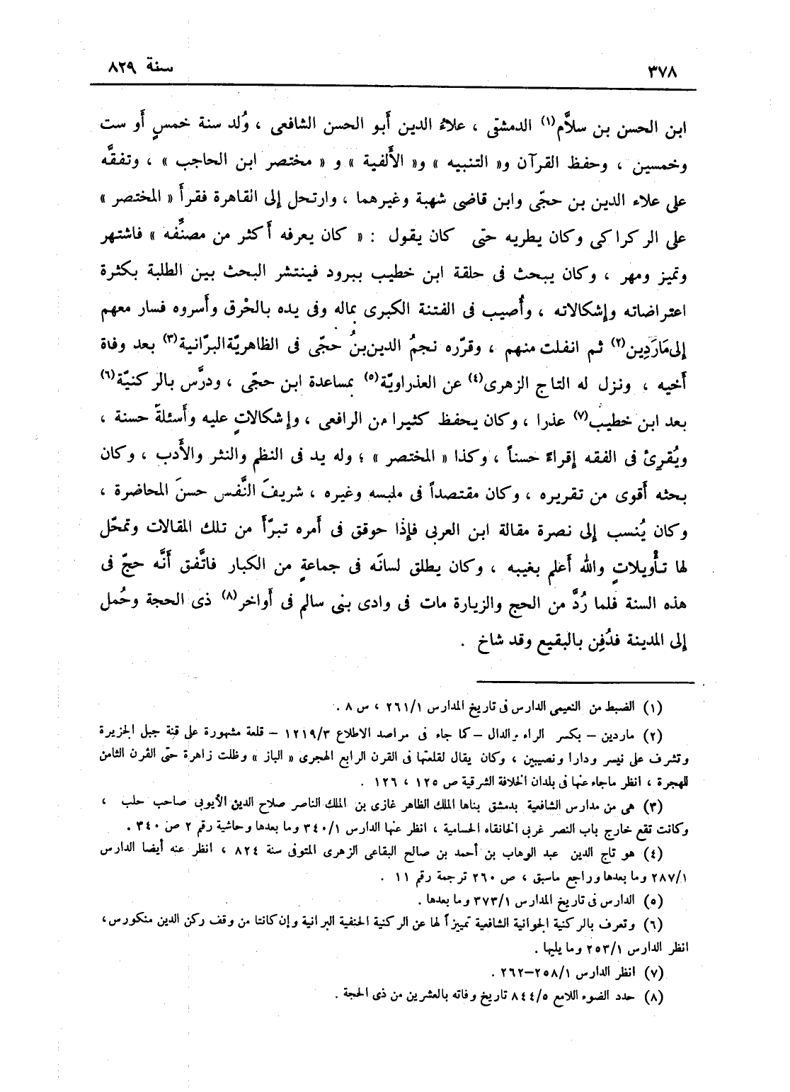 بن الحسن بن سلام الدمشقي علاء الدين أبو الحسن الشافعي، ولد سنة خمس أو ست وخمسين، وحفظ القرآن والتنبيه والألفية ومختصر ابن الحاجب، وتفقه على علاء الدين ابن حجي وابن قاضي شهبة وغيرهما كالشهابين الزهري والحسباني، وارتحل إلى القاهرة فقرأ بها الأصول على الضياء القرمي والمختصر على الركراكي المكي وكان يطريه حتى كان يقول: كان يعرفه أكثر من مصنفه، فاشتهر وتميز ومهر، فكان يبحث في حلقة ابن خطيب يبرود فينتشر البحث بين الطلبة بكثرة تفننه وإشكالاته، وأصيب في الفتنة الكبرى بما له وفي يده بالحرق، وأسروه فسار معهم إلى ماردين ثم انفلت منهم، وقرره نجم الدين ابن حجي في الظاهرية البرانية بعد وفاة أخيه، ونزل له التاج الزهري عن العذراوية بمساعدة ابن حجي، ودرس بالركنية بعد ابن خطيب عذراء، وكان يحفظ كثيراً من الرافعي وإشكالات عليه وأسئلة حسنة، ويقرئ في الفقه إقراء حسناً وكذا المختصر، وله يد في النظم والأدب والنثر، وكان بحثه أقوى من تقريره، وكان مقتصداً في ملبسه وغيره شريف النفس حسن المحاضرة، وكان ينسب إلى نصرة مقالة ابن عربي، فإذا حوقق في أمره تبرأ من تلك المقالات ويتحمل لها تأويلات والله أعلم بغيبه، وكان يطلق لسانه في جماعة من الكبار، واتفق أنه حج في هذه السنة فلما رد من الحج والزيارة مات في وادي بني سالم في أواخر ذي الحجة، وحمل إلى المدينة فدفن في البقيع وقد شاخ،