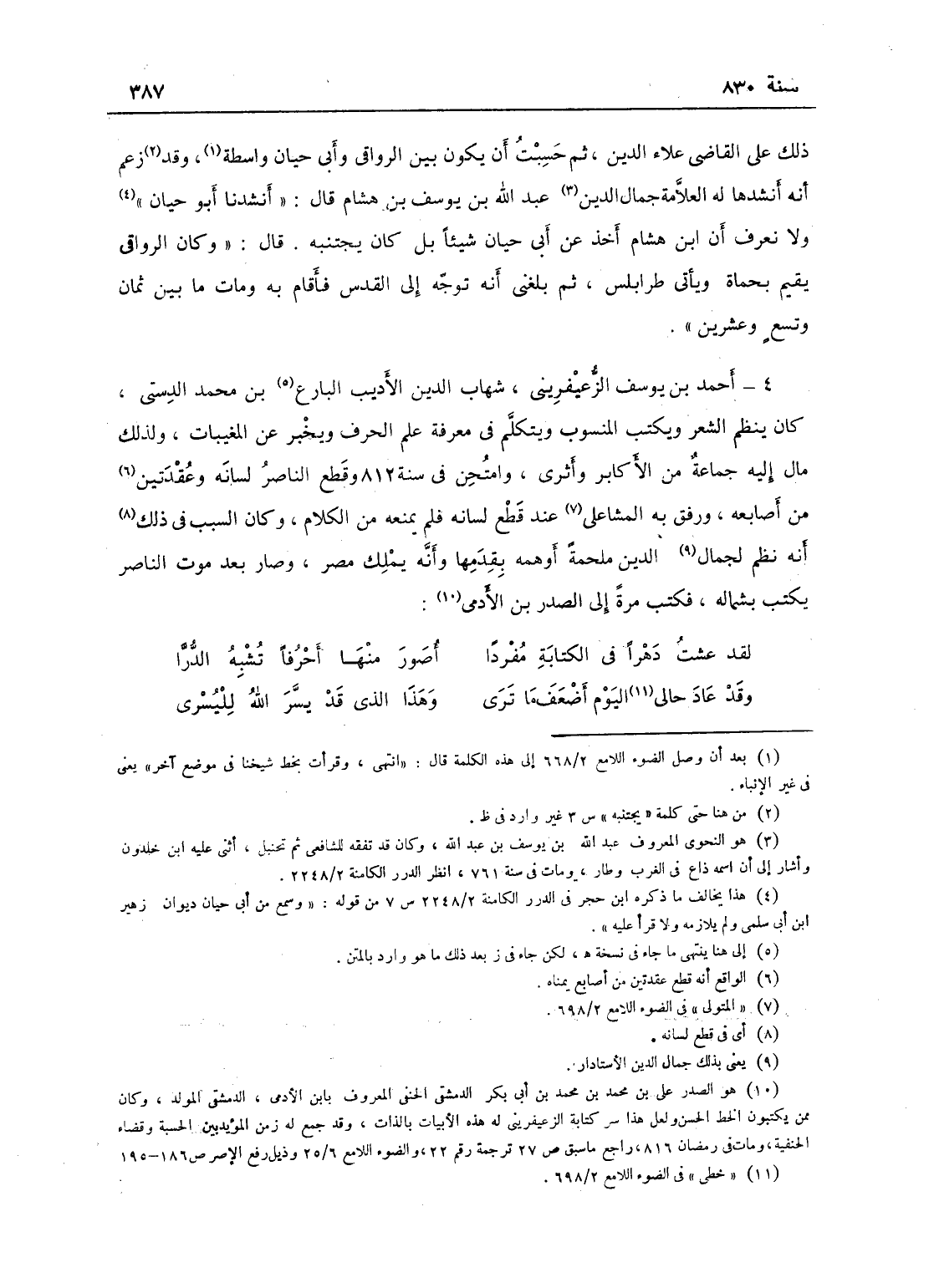 أحمد بن يوسف، الزعيفريني شهاب الدين الأديب البارع كان ينظم الشعر ويكتب المنسوب، ويتكلم في معرفة علم الحرف ويخبر عن المغيبات، ولذلك مال إليه جماعة من الأكابر وأثرى، وامتهن في سنة ثمانمائة واثنتي عشرة وقطع الناصر لسانه وعقدتين من أصابعه، ورفق به المشاعلي عند قطع لسانه فلم يمنعه من الكلام، وكان السبب في ذلك أنه نظم لجمال الدين ملحمة أوهمه أنها قديمة وأنه يملك، وصار بعد موت الناصر يكتب بشماله، وكتب مرة إلى الصدر ابن الأدمي:
