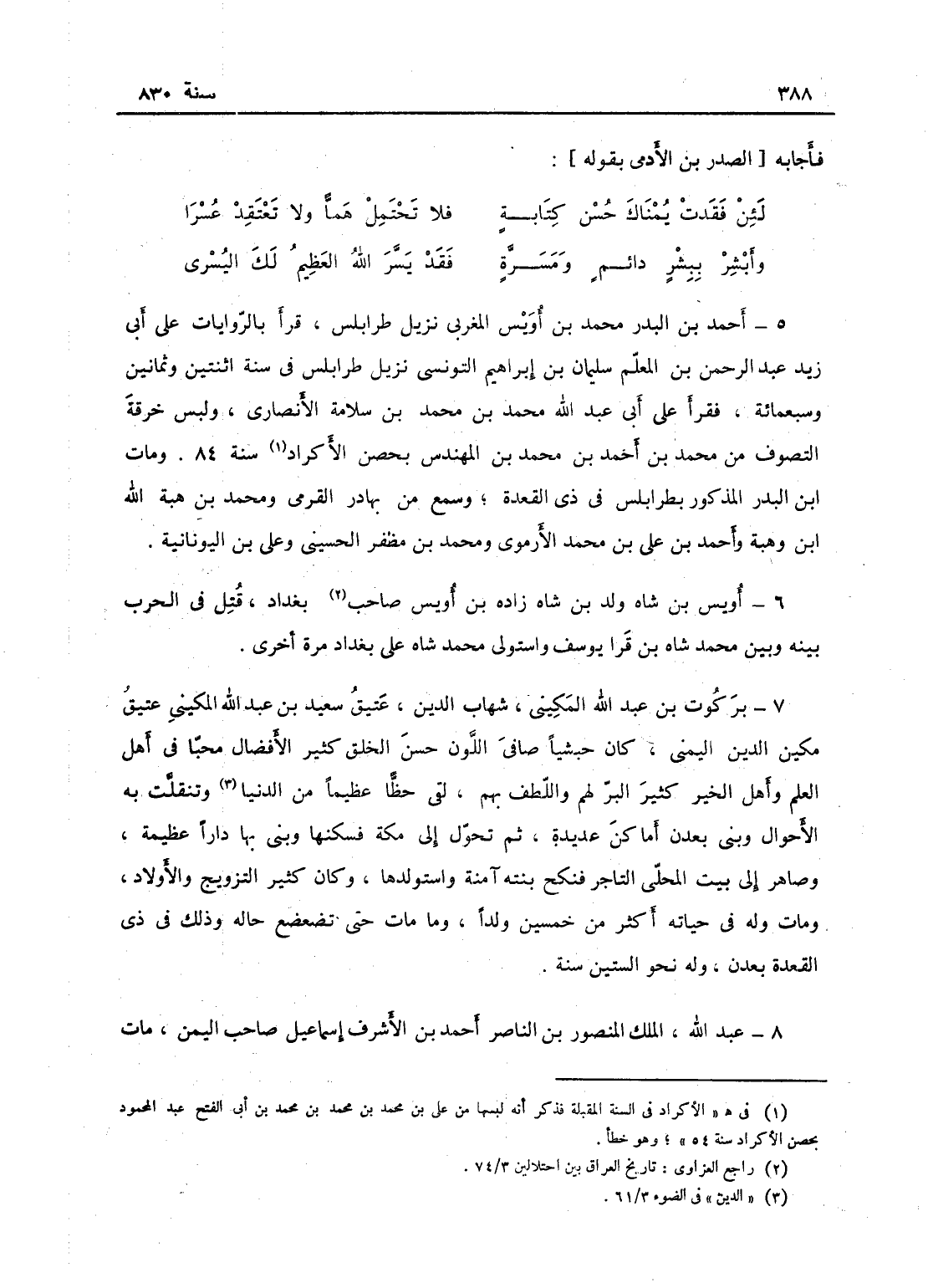أحمد بن البدر بن محمد بن أويس، المغربي نزيل طرابلس، قرأ بالروايات على أبي زيد عبد الرحمن بن المعلم سليمان بن إبراهيم التونسي نزيل طرابلس في سنة اثنتين وثمانين وسبعمائة فقرأه علي أبي عبد الله محمد بن محمد بن سلامة الأنصاري، ولبس خرقة التصوف من محمد بن أحمد بن محمد بن المهندس بحصن الأكراد في السنة المقبلة، وذكر انه لبسها من علي بن محمد بن محمد بن أبي الفتح عبد المحمود بمدينة بحصن الأكراد سنة 54؛ ومات ابن البدر المذكور بطرابلس في ذي القعدة، وسمع من بهادر القرمي ومحمد بن هبة الله بن وهبة وأحمد بن علي بن محمد الأرموي ومحمد بن مظفر الحسيني وعلي بن اليونانية.