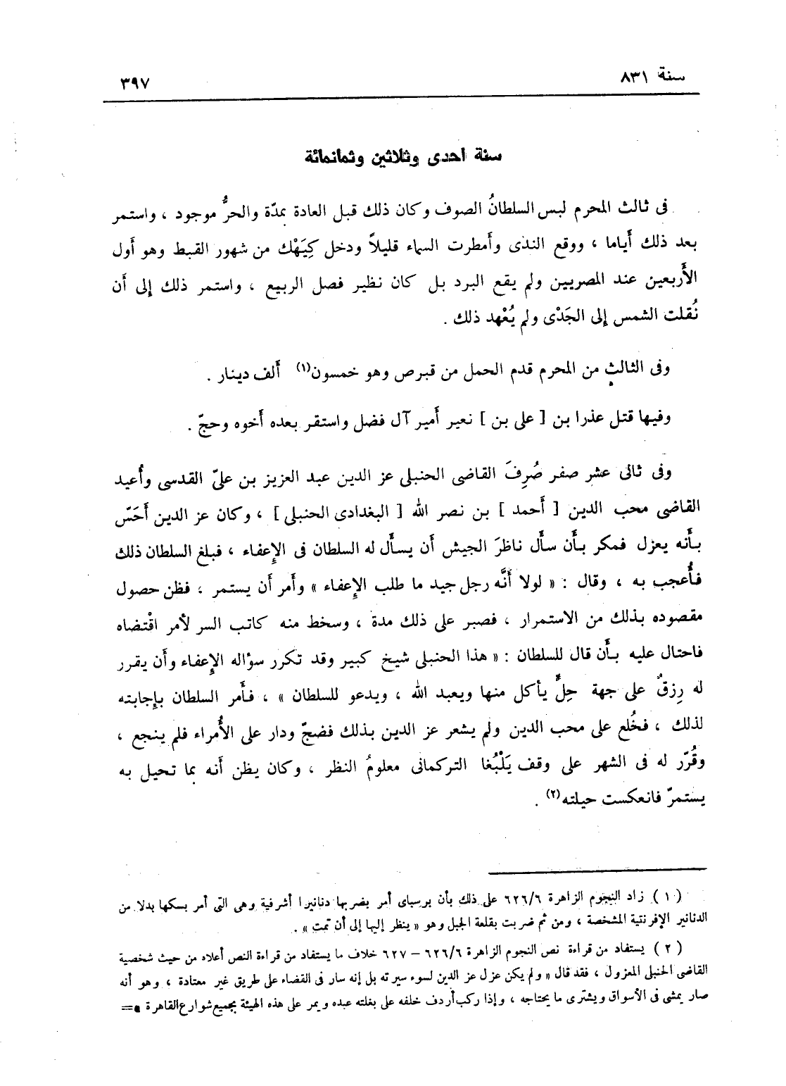 وفي ثاني عشر صفر صرف القاضي الحنبلي عز الدين عبد العزيز ابن علي المقدسي وأعيد القاضي محب الدين بن نصر الله، وكان عز الدين أحس بأن يعزل فمكر بأن سأل ناظر الجيش أن يسأل له السلطان في الإعفاء، فبلغ السلطان ذلك فأعجب به وقال: لولا أنه رجل جيد ما طلب الإعفاء، وأمر أن يستمر فظن حصول مقصوده بذلك من الاستمرار وصبر على ذلك مدة، وسخط منه كاتب السر لأمر اقتضاه فاحتال عليه بأن قال للسلطان: هذا الحنبلي شيخ كبير وقد تكرر سؤاله الإعفاء وأن يقرر له رزق على جهة حل يأكل منها ويعبد الله ويدعو للسلطان، فأمر السلطان بإجابته لذلك، فخلع على محب الدين ولم يشعر عز الدين بذلك، فضج ودار على الأمراء فلم ينجع، وقرر له في الشهر على وقف تنبغا التركماني معلوم النظر، وكان يظن أنه بما تحيل به يستمر فانعكست حيلته.