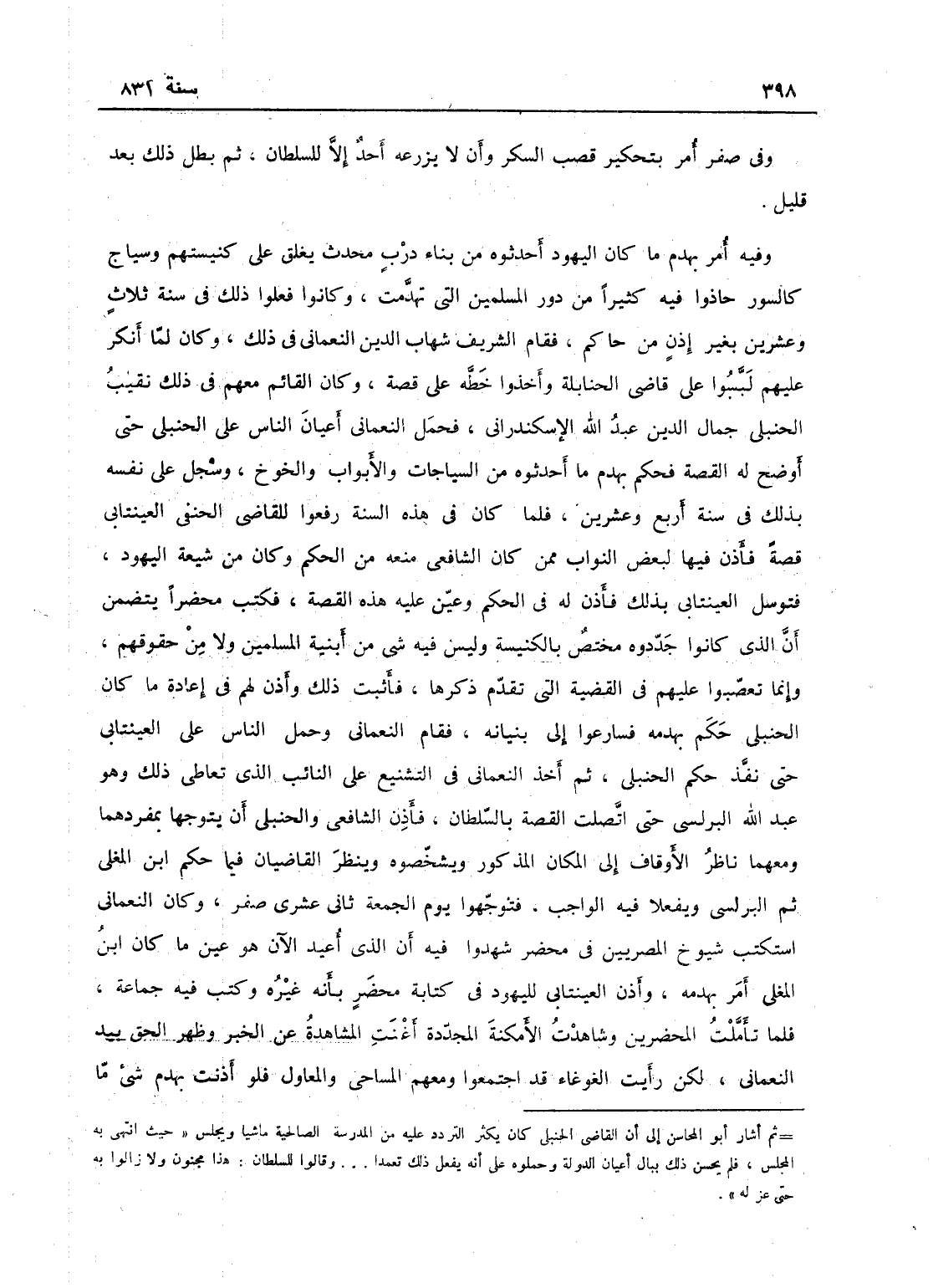 وفي صفر أمر بتحكير قصب السكر وأن لا يزرعه أحد إلا السلطان، ثم بطل ذلك بعد قليل، وفيه أمر بهدم ما كان اليهود أحدثوه من بناء درب محدث يغلق على كنيستهم وسياج كالسور، حازوا فيه كثيراً من دور المسلمين التي تهدمت، وكانوا فعلوا ذلك في سنة ثلاث وعشرين بغير إذن من حاكم، فقام الشريف شهاب الدين النعماني في ذلك، وكان لما أنكر عليهم لبسوا على قاضي الحنابلة وأخذوا خطه على قصة، وكان القائم معهم في ذلك نقيب الحنبلي جمال الدين عبد الله الإسكندراني، فحمل النعماني أعيان الناس على الحنبلي حى أوضح له القصة فحكم بهدم ما أحدثوه من السياجات والأبواب والخوخ، وسجل على نفسه بذلكم في سنة أربع وعشرين، فلما كان في هذه السنة رفعوا للقاضي الحنفي العينتابي قصة، فأذن فيها لبعض النواب ممن كان الشافعي منعه من الحكم وكان من شيعة الهروي فتوسل للعينتابي بذلك، فأذن له في الحكم وعين عليه هذه القصة، فكتب محضراً يتضمن أن الذي كانوا جددوه مختص بالكنيسة وليس فيه شيء من أبنية المسلمين ولا من حقوقهم وإنما تعصبوا عليهم في القصة التي تقدم ذكرها، فأثبت ذلك وأذن لهم في إعادة ما كان الحنبلي حكم بهدمه، فسارعوا إلى بنيانه، فقام النعماني وحمل الناس على العبنتابي حتى نفذ حكم الحنبلي، ثم أخذ النعماني في التشنيع على النائب الذي تعاطى ذلك وهو عبد الله البرلسي حتى اتصلت القصة بالسلطان، فأذن للشافعي والحنبلي أن يتوجها بمفردهما ومعهما ناظر الأوقاف إلى المكان المذكور ويشخصوه وينظر القاضيان فيما حكم به ابن المغلي ثم البرلسي ويفعلا فيه الواجب، فتوجها يوم الجمعة ثاني عشري صفر، وكان النعماني استكتب شيوخ المصريين في محضر شهدوا فيه أن الذي أعيد الآن هو عين ما كان ابن المغلي أمر بهدمه، وأذن العينتابي لليهود في كتابة محضر بأنه غيره وكتب فيه جماعة، فلما تأملت المحضرين وشاهدت الأمكنة المجددة أغنت المشاهدة عن الخبر فظهر الحق بيد النعماني، لكن رأيت الغوغاء قد اجتمعوا ومعهم المساحي والمعاول، فلو أذنت بهدم شيء ما