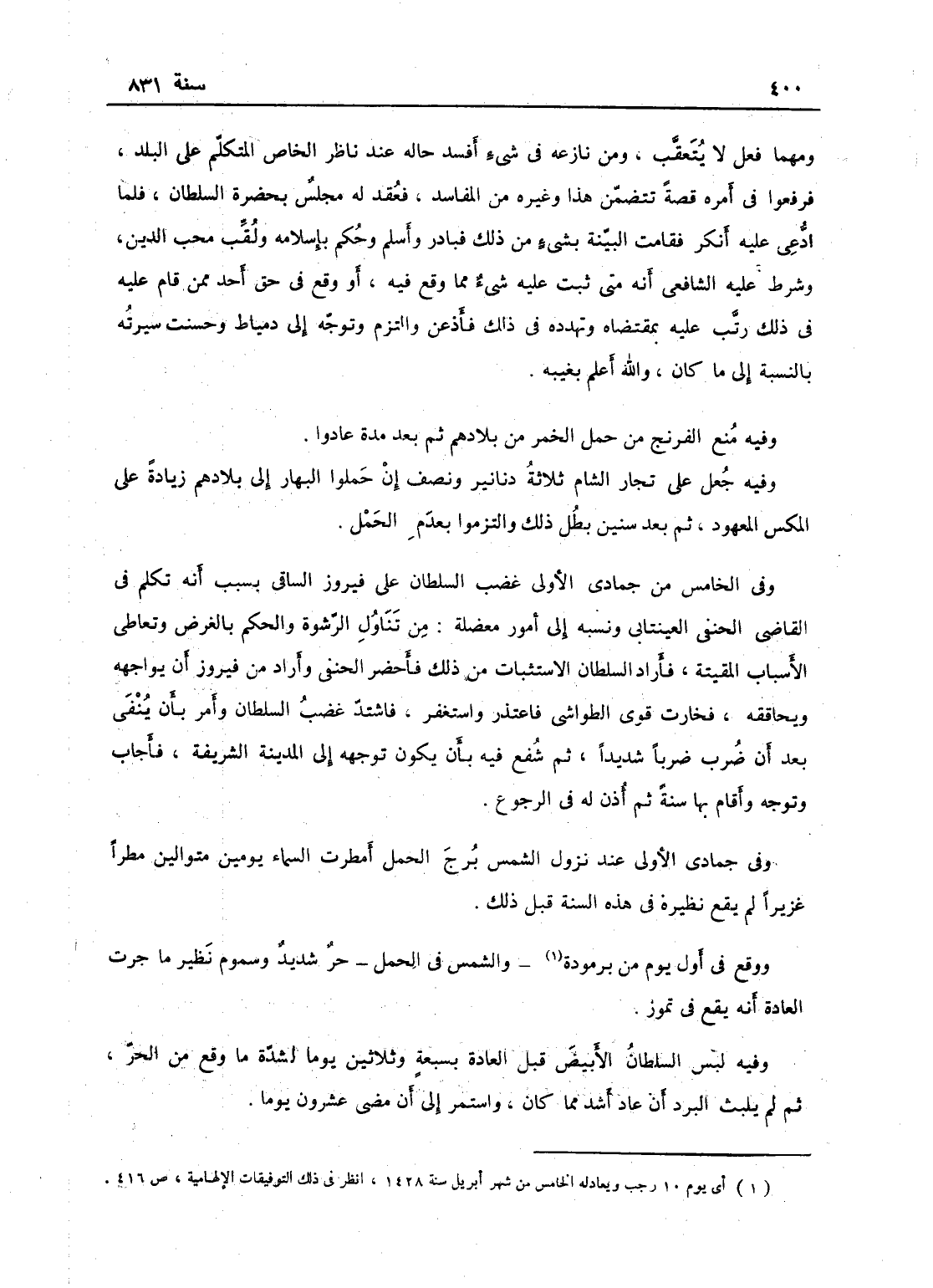 وفيه لبس السلطان الأبيض قبل العادة بسبعة وثلاثين يوماً لشدة ما وقع من الحر، ثم لم يلبث البرد أن عاد أشد ما كان واستمر إلى مضي عشرين يوماً.