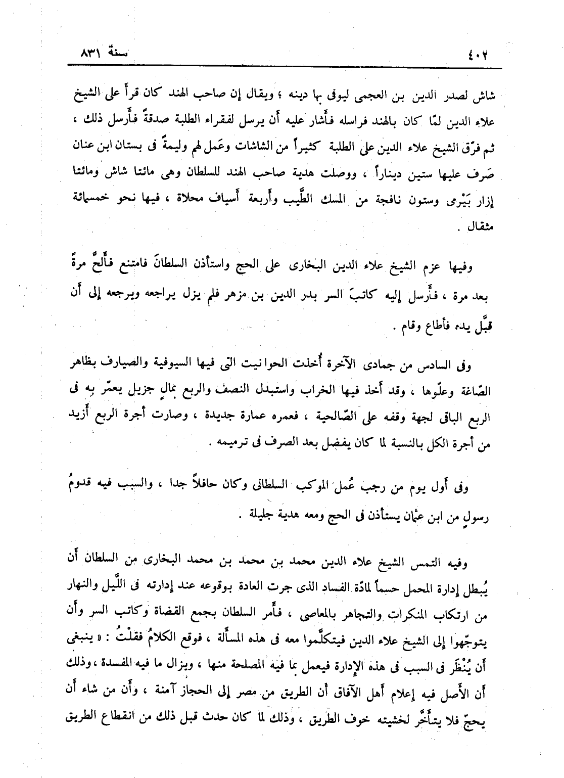 وفيه التمس الشيخ علاء الدين محمد بن محمد بن محمد البخاري من السلطان أن يبطل إدارة المحمل حسماً لمادة الفساد الذي جرت العادة بوقوعه عند إدارته في الليل والنهار من ارتكاب المنكرات والتجاهر بالمعاصي، فأمر السلطان بجمع القضاة وكاتب السر وأن يتوجهوا إلى الشيخ علاء الدين ويتكلموا معه في هذه المسالة، فوقع الكلام فقلت: ينبغي أن ينظر في السبب في هذه الإدارة فيعمل بما فيه المصلحة منها ويزال ما فيه المفسدة، وذلك أن الأصل فيه إعلام أهل الآفاق أن الطريق من مصر إلى الحجاز آمنة، وأن من شاء أن يحج فلا يتأخر لخشية خوف الطريق؛ وذلك لما كان حدث قبل ذلك من انقطاع الطريق