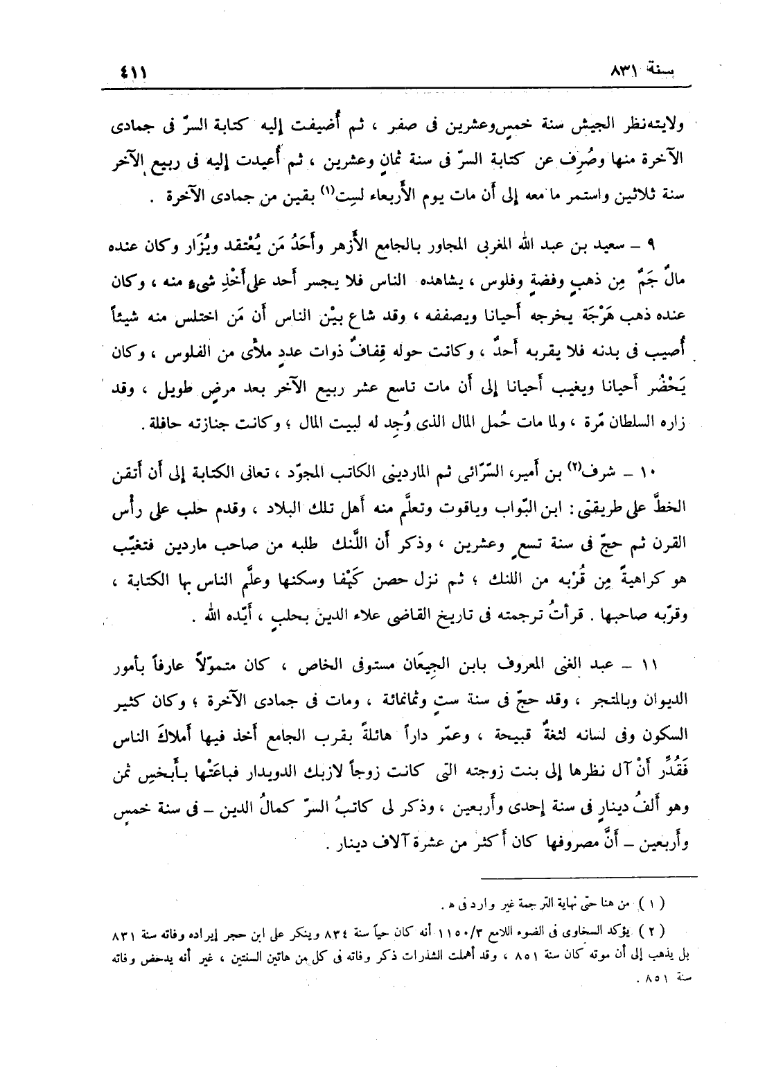 عبد الغني المعروف بابن الجيعان مستوفي الخاص، كان متمولا عارفاً بأمور الديوان وبالمتجر، وقد حج في سنة ست وثمانمائة، مات في جمادى الآخرة، وكان كثير السكون، وفي لسانه لثغة قبيحة، وعمر دارا هائلة بقرب الجامع أخذ فيها أملاك الناس، فقدر أنها آل نظرها إلى بيت زوجته التي كانت زوجاً لأزبك - الدوادار - فباعتها بأبخس ثمن وهو ألف دينار في سنة إحدى وأربعين، وذكر لي كمال الدين كاتب السر في سنة خمس وأربعين أن مصروفها كان أكثر من عشرة آلاف دينار.