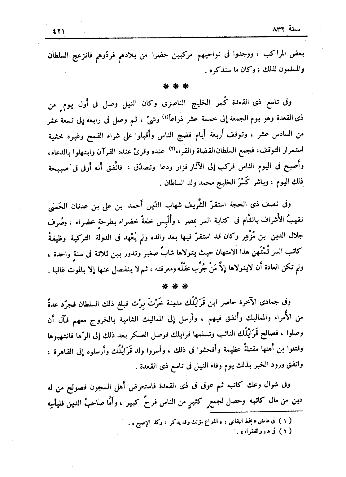 وفي تاسع ذي القعدة كسر الخليج الناصري، وكان النيل وصل في اول يوم من ذي القعدة وهو يوم الجمعة إلى خمسة عشر ذراعاً وشيء، ثم وصل في رابعه إلى تسعة عشر إصبعاً من السادس عشر وتوقف أربعة ايام، فضج الناس وأقبلوا على شراء القمح وغيره خشية استمرار التوقف، فجمع السلطان القضاة والفقراء عنده وقرئ عنده القرآن وابتهلوا بالدعاء واصبح، في اليوم الثامن فركب إلى الآثار فزار ودع وتصدق، فاتفق أنه أوفى في صبيحة ذلك اليوم، وباشر كسر الخليج محمد ولد السلطان.