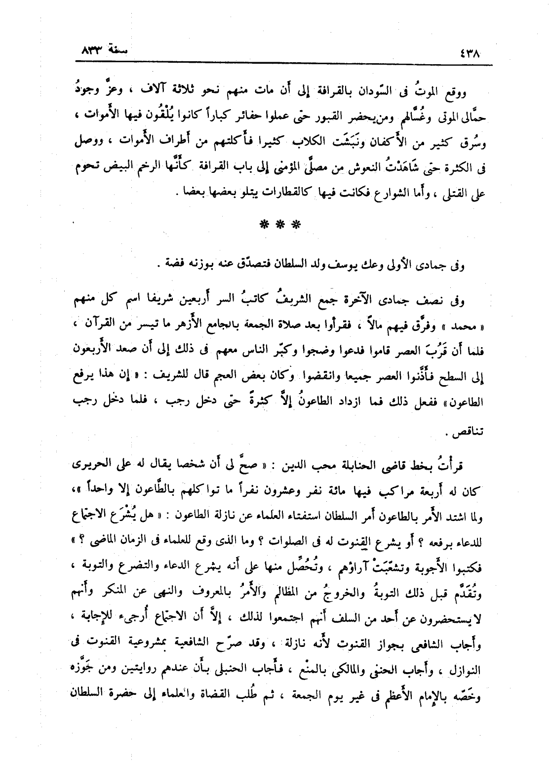 وفي نصف جمادى الآخرة جمع الشريف كاتب السر أربعين شريفاً اسم كل منهم محمد وفرق فيهم مالاً، فقرأ بعد صلاة الجمعة بالجامع الازهر ما تيسر من القرآن، فلما أن قرب العصر قاموا فدعوا وضجوا. وكثر الناس معهم في ذلك إلى أن صعد الأربعون إلى السطح فأذنوا العصر جميعاً وانفضوا، وكان بعض العجم قال للشريف إن هذا يدفع الطاعون، ففعل ذلك فما ازداد الطاعون إلا كثرة حت دخل رجب، فلما دخل رجل تناقص؛ قرأت بخط قاضي الحنابلة محب الدين أن شخصاً يقال له على الحريري كان له أربعة مراكب فيها مائة نفر وعشرون نفراً ماتوا كلهم بالطاعون إلا واحداً، ولما اشتد الامر بالطاعون أمر السلطان باستفتاء العلماء عن نازلة الطاعون هل يشرع الاجتماع للدعاء برفعه أو يشرع القنوت له في الصلوات؟ وما الذي وقع للعلماء في الزمن الماضي؟ فكتبوا الأجوبة وتشعبت آراؤهم وتحصل منها على انه يشرع الدعاء والتضرع والتوبة، وتقدم قبل ذلك التوبة، والخروج من المظالم، والأمر بالمعروف والنهي عن المنكر، وانهم لا يستحضرون عن أحد من السلف أنهم اجتمعوا لذلك إلا أن الاجتماع أرجى للإجابة؛ وأجاب الشافعي بجواز القنوت، لأنها نازلة وقد صرح الشافعية بمشروعية القنوت في النوازل، وأجاب الحنفي والمالكي بالمنع، واجاب الحنبلي بأن عندهم روايتين ومن جوزه خصه بالإمام الاعظم في غير يوم الجمعة؛ ثم طلب القضاة والعلماء إلى حضرة السلطان