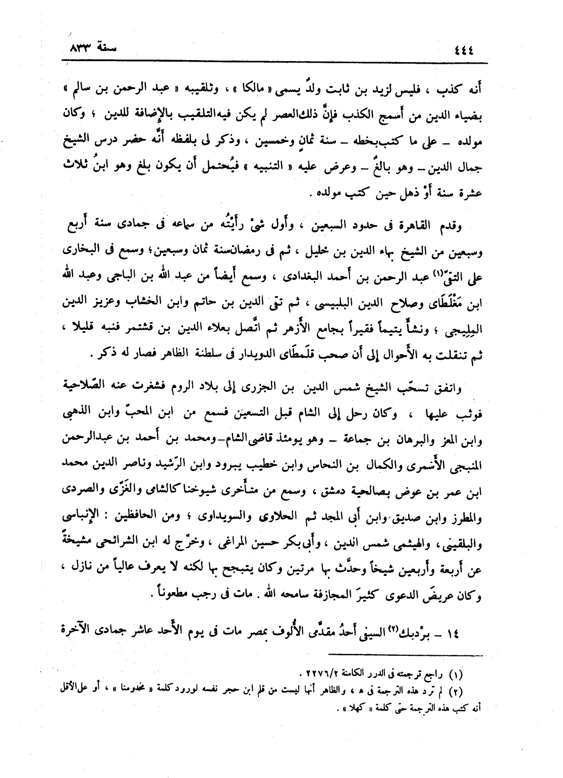 أنه كذب، وليس لزيد بن ثابت ولد يسمى مالكاً، وتلقيبه عبد الرحمن بن سالم ضياء الدين من أسمج الكذب، فإن ذلك العصر لم يكن التلقيب فيه - بالإضافة للدين، وكان مولده على ما كتب بخطه سنة ثمان وخمسين، وذكر لي بلفظه أنه حضر درس الشيخ جمال الدين وهو بالغ وعرض عليه التنبيه، فيحتمل أن يكون بلغ وهو ابن ثلاث عشرة سنة أو ذهل حين كتب مولده، وقدم القاهرة في حدود السبعين، واول شيء رأيته من سماعه في جمادى سنة أربع وسبعين من الشيخ بهاء الدين بن خليل ثم في رمضان سنة ثمان وسبعين، سمع في البخارى على التقي عبد الرحمن بن أحمد البغدادي، وسمع أيضاً من عبد الله بن الناجي وعبد الله بن مغلطاي وصلاح الدين البلقيني، ثم من تقي الدين بن حاتم وابن الخشاب وعزيز الدين المليجي، ونشأ يتيماً فقيراً بجامع الأزهر، ثم اتصل بعلاء الدين بن قشتمر فنبه قليلاً، ثم تنقلت به الاحوال إلى أن صحب قلطماي الدويدار في سطلنة الظاهر فصار له ذكر، واتفق تسحب الشيخ شمس الدين ابن الجزري إلى بلاد الروم فشغرت عنه الصلاحية فوثب عليها، وكان رحل إلى الشام قبل التسعين فسمع ابن المحب وابن الذهبي وابن العز والبرهان بن جماعة وهو يومئذ قاضي الشام ومحمد بن أحمد بن عبد الرحمن المنبجي الأسمري والكمال بن النحاس وابن خطيب يبرود وابن الرشيد وناصر الدين محمد بن عمر بن عوض بصالحية دمشق، وسمع من متقدمي شيوخنا كالشامي والغزي والصردي والمطرز وابن صديق وابن أبي المجد ثم الحلاوي والسويداوي ومن الحافظين والأبناسي واللقيني والهيثمي شمس الدين وابي بكر بن حسين المراغي - وخرج له ابن الشرائحي مشيخة عن أربعة وأربعين شيخاً وحدث بها مرتين وكان يتبجح بها لكنه لا يعرف عالياً من نازل، وكان عريض الدعوى كثير المجازفة - سامحه الله! مات في رجب مطعوناً.