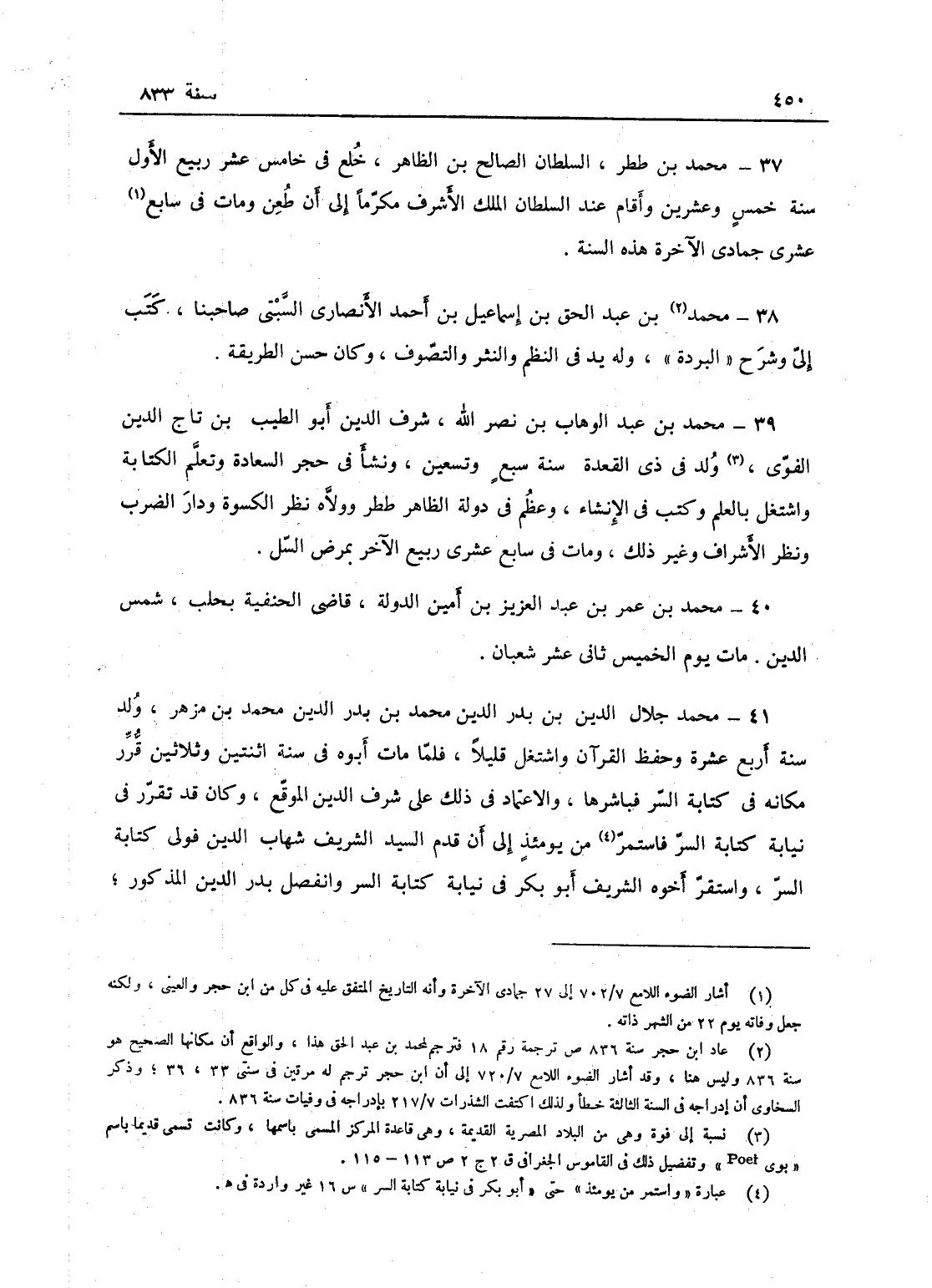 محمد بن ططر السلطان الصالح بن الطاهر، خلع في خامس عشر ربيع الأول سنة خمس وعشرين، وأقام عند السلطان الملك الأشرف مكرماً إلى أن طعن، ومات في سابع عشري جمادى الآخرة هذه السنة.