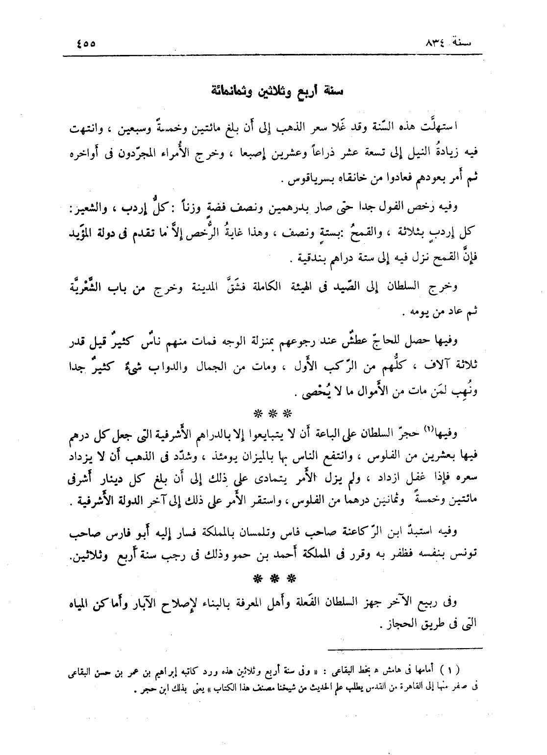وفيها حجر السلطان على المباعة أن لا يتبايعوا إلا بالدراهم الأشرفية التي جعل لكل درهم منها بعشرين من الفلوس، وانتفع الناس بها بالميزان، وشدد في الذهب أن لا يزاد في سعره، فإذا قل ازداد، ولم يزل الأمر يتمادى على ذلك إلى أن بلغ كل دينار أشرفي مائتين وخمسة وثماتين درهماً من الفلوس. واستقر الأمر على ذلك إلى آخر الدولة الأشرفية.