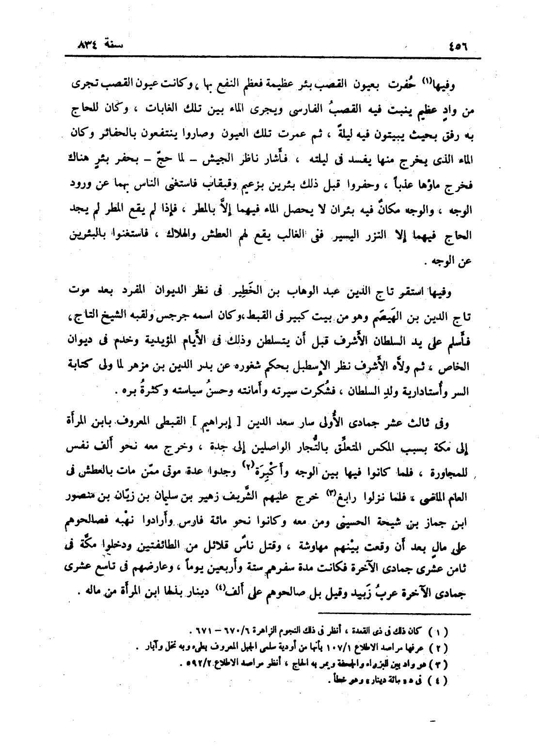 وفيها حفرت بعيون القصب بئر عظيمة فعظم النفع بها، وكانت عيون القصب تجري من واد عظيم ينبت فيه القصب الفارسي ويجري الماء بين تلك الغابات، وكان للحاج به رفق بحيث يبيتون فيه ليلة، ثم عمرت تلك العيون وصاروا يقتنعون بالحفائر، وكان الماء الذي يخرج منها يفسد في ليلته، فأشار ناظر الجيش لما حج بحفر بئر هناك فخرج ماؤها عذباً، وحفروا قبل ذلك بئرين بزعيم وقبقاب، فاستغنى الناس بهما عن ورود الوجه، والوجه مكان فيه بئران لا يحصل الماء فيهما إلا بالمطر، فإذا لم يقع المطر ووردهما الحاج لم يجدوا فيهما إلا النزر اليسير، وفي الغالب يقع لهم العطش والهلاك فاستغنوا بالبئرين عن الوجه.