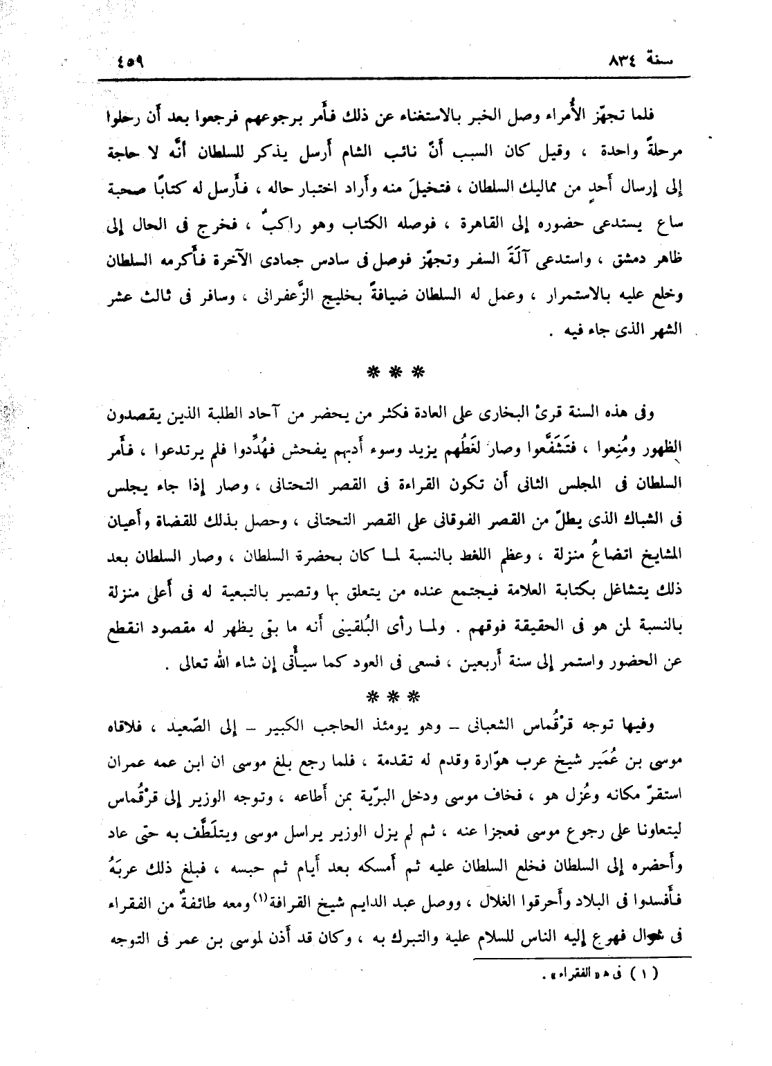 وفي هذه السنة قرئ البخارى على العادة، فكثر من يحضر من آحاد الطلبة الذين يقصدون الظهور ومنعوا فشغبوا، وصار لغطهم يزيد وسوء أدبهم يفحش فهددوا فلم يرتدعوا، فأمر السلطان في المجلس الثاني أن تكون القراءة في القصر التحتاني، وصار إذا جاء يجلس في الشباك الذي يطل من القصر الفوقاني على القصر التحتاني، وحصل بذلك للقضاة ولأعيان المشايخ اتضاع منزلة، وعظم اللغط بالنسبة لما كان يحضره السلطان، وصار السلطان بعد ذلك يتشاغل بكتابة العلامة فيجتمع عنده من يتعلق بها ويصير بالتبعية له في أعلى منزلة بالنسبة لمن هو في الحقيقة فوقهم؛ ولما رأى ابن البلقيني أنه ما بقي يظهر له مقصود انقطع عن الحضور، واستمر إلى سنة أربعين، فسعى في العود كما سيأتي إن شاء الله تعالى.