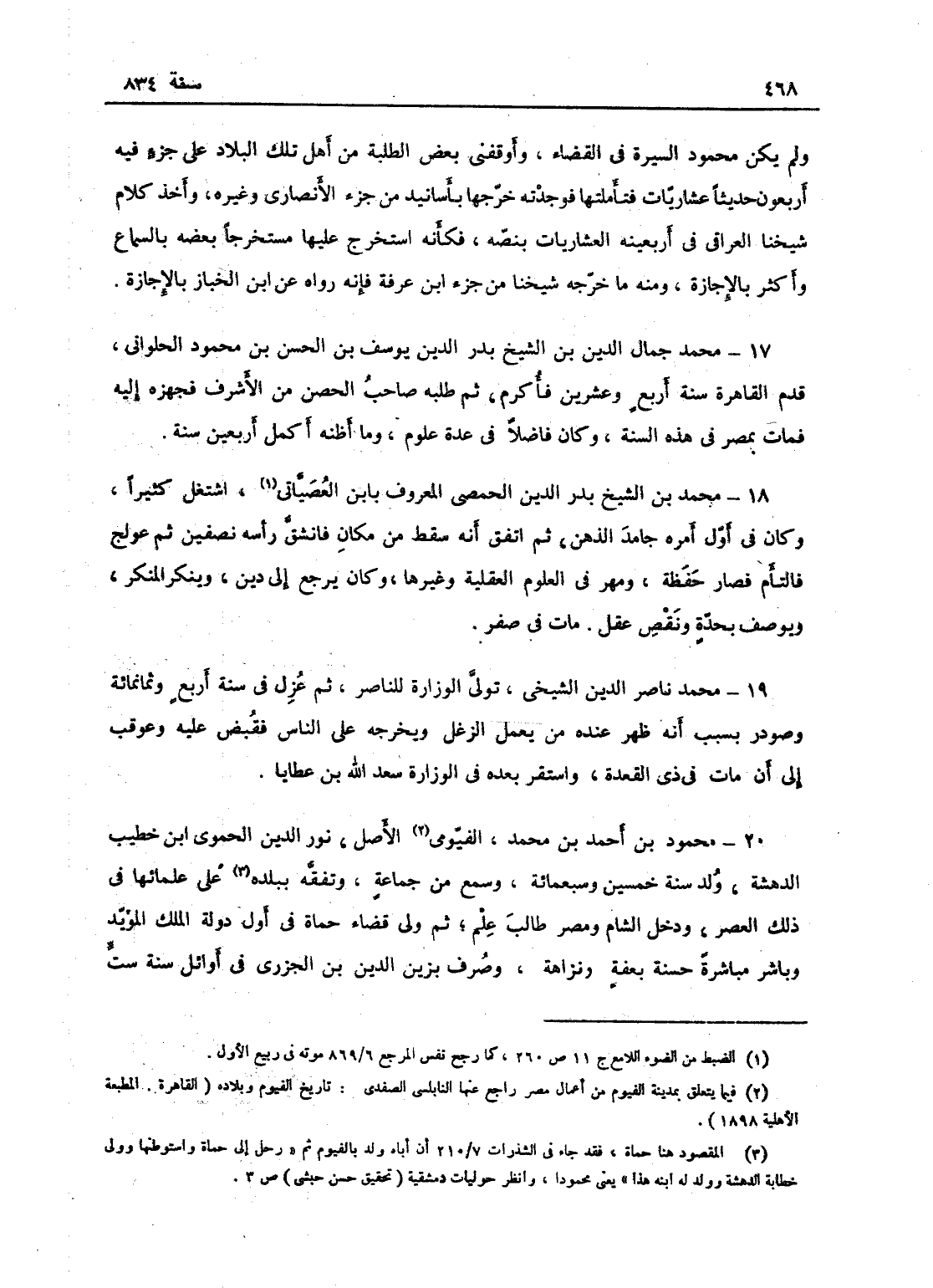 محمود بن أحمد بن محمد، الفيومي الأصل نور الدين الحموي ابن خطيب الدهشة، ولد سنة خمسين وسبعمائة، وسمع من جماعة وتفقه ببلده على علمائها في ذلك العصر ودخل الشام ومصر طالب علم، ثم ولي قضاء حماة في أول دولة المماليك المؤيد وباشر مباشرة حسنة بعفة ونزاهة وصرف بزين الدين ابن الخزري في أوائل سنة ست