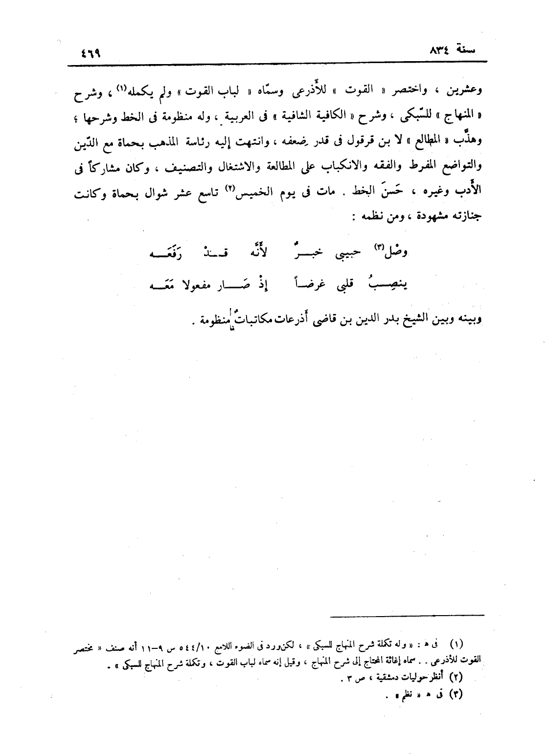 وعشرين، واختصر القوت للأذرعي وسماه لباب القوت، وله تكملة شرح المنهاج للسبكي، وشرح الكافية الشافية في العربية، وله منظومة في الخط وشرحها، وهذب المطالع لابن قرقور في قدر ضعفه وانتهت إليه رئاسة المذهب بحماة مع الدين والتواضع المفرط والعفة، والانكباب على المطالعة والاشتغال والتصنيف، وكان مشاركاً في الأدب وغيره وحسن الخط؛ مات في يوم الخميس تاسع عشر شوال بحماة، وكانت جنازته مشهودة، ومن نظمه: