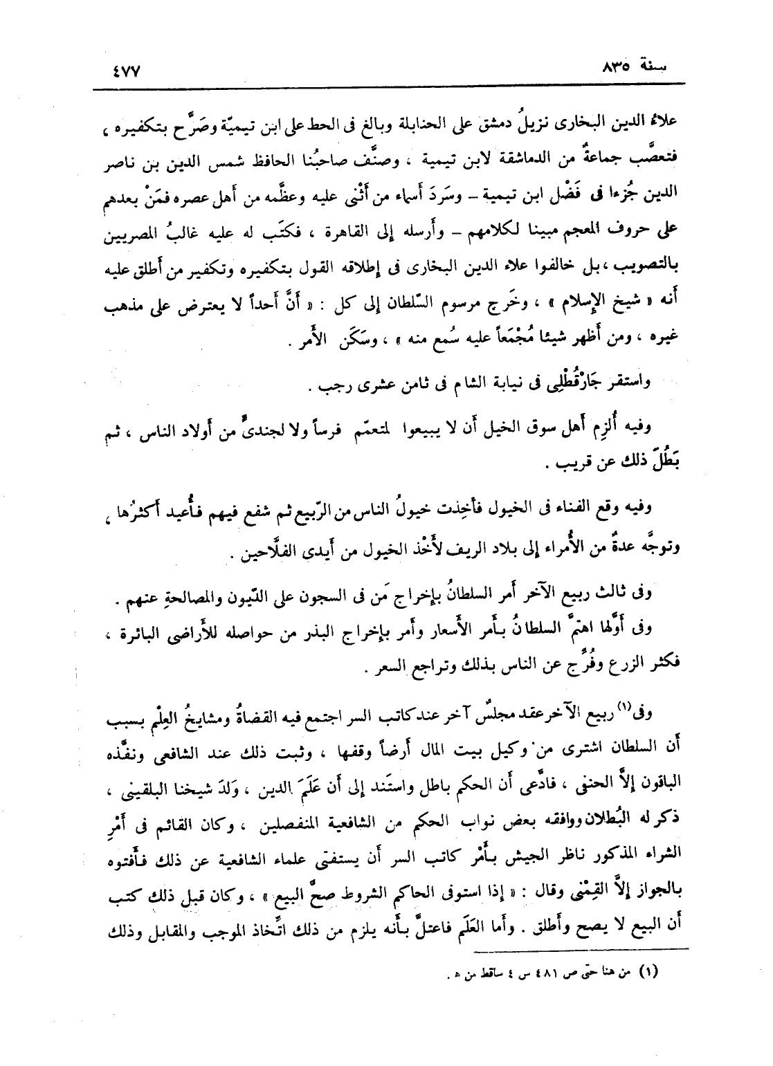 علاء الدين البخارى نزيل دمشق على الحنابلة وبالغ في الحط على ابن تيمية وصرح بتفكيره، فتعصب جماعة من الدماشقة لابن تيمية، وصنف صاحبنا الحافظ شمس الدين ابن ناصر الدين جزءاً في فضل ابن تيمية وسرد أسماء من أثنى عليه من أهل عصره فمن بعدهم على حروف المعجم مبيناً لكلامهم وأرسله إلى القاهرة، فكتب له عليه غالب المصريين بالتصويت، وخالفوا علاء الدين البخارى في إطلاقه القول بتفكيره وتفكير من أطلق عليه أنه شيخ الإسلام، وخرج مرسوم السلطان على أن كل أحد لا يعترض على مذهب غيره ومن أظهر شيئاً مجمعا عليه سمع منه، وسكن الأمر؛ واستقر جارقطلي في نيابة الشام في ثامن عشرى رجب، وفيه ألزم أهل سوق الخيل أن لا يبيعوا لمعم فرساً ولا لجندي من أولاد الناس، ثم بطل ذلك عن قرب، وفيه وقع الفناء في الخيول، فأخذت الناس من الربيع ثم شفع فيهم فأعيد أكثرها، وتوجه عدة من الأمراء إلى بلاد الريف لأخذ الخيول من أيدي الفلاحين.