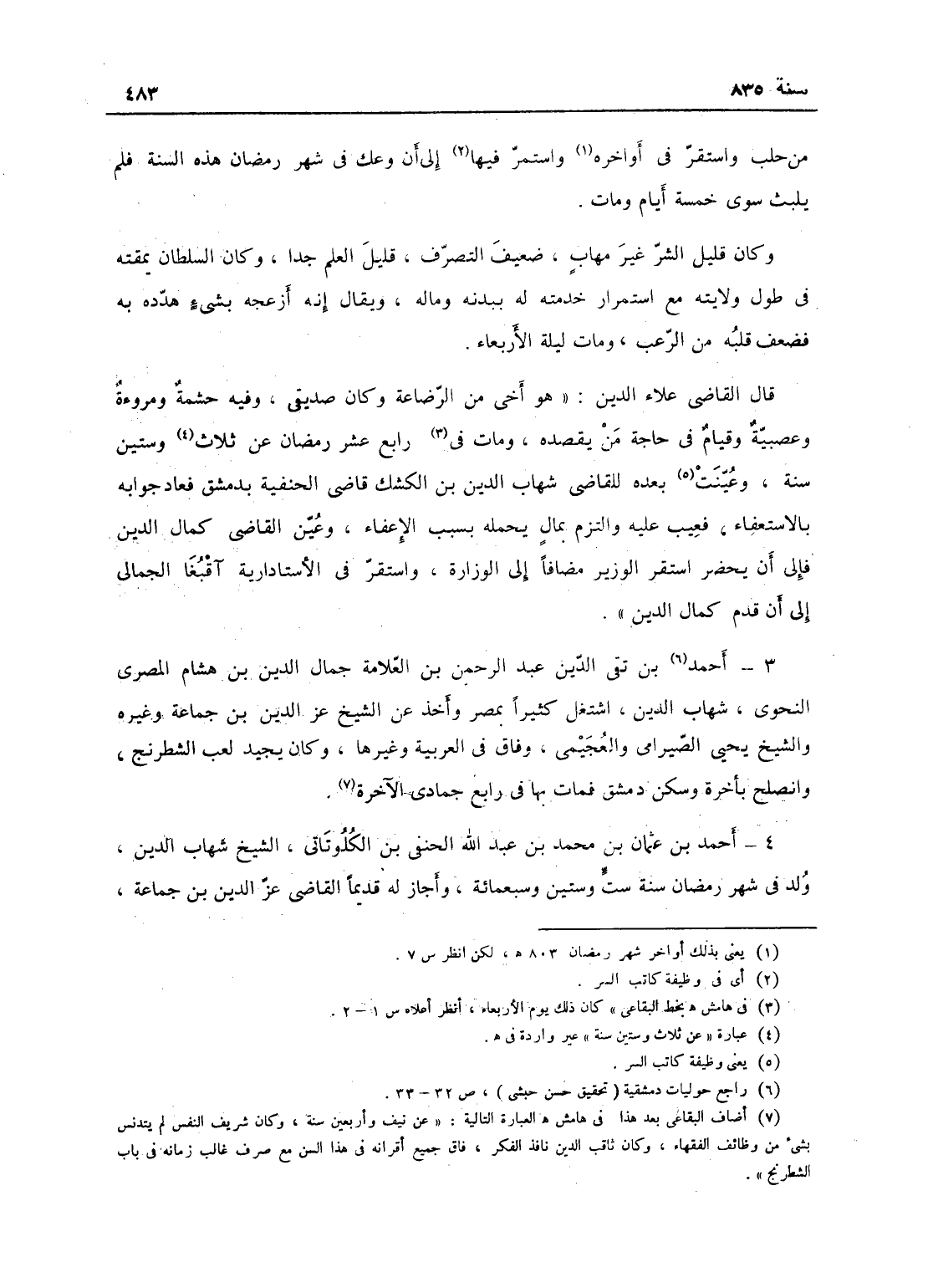 من حلب، واستقر في أواخره، واستمر فيها إلى أن وعك في شهر رمضان هذه السنة فلم يلبث سوى خمسة أيام ومات. وكان قليل الشر غير مهاب ضعيف التصرف قليل العلم جداً، وكان السلطان يمقته في طول ولايته مع استمرار خدمته له ببدنه وماله، ويقول إنه أزعجه بشئ هدده به فضعف قلبه من الرعب ومات منها؛ قال القاضي علاء الدين: هو أخي من الرضاعة وكان صديقي وفيه حشمة ومروءة وعصبية وقيام في حاجة من يقصده؛ ومات في ليلة الأربعاء 14 رمضان عن ثلاث وستين، وعينت بعده للقاضي شهاب الدين ابن الكشك قاضي الحنفية بدمشق فعاد جوابه بالإستعفاء فعيب عليه، والتزم بمال يحمله بسبب الإعفاء، وعين القاضي كمال الدين البارزي، فإلى أن يحضر استقر الوزير كريم الدين مضافاً إلى الوزارة، واستقر في الأستادارية آقبغا الجمالي إلى أن قدم جمال الدين.