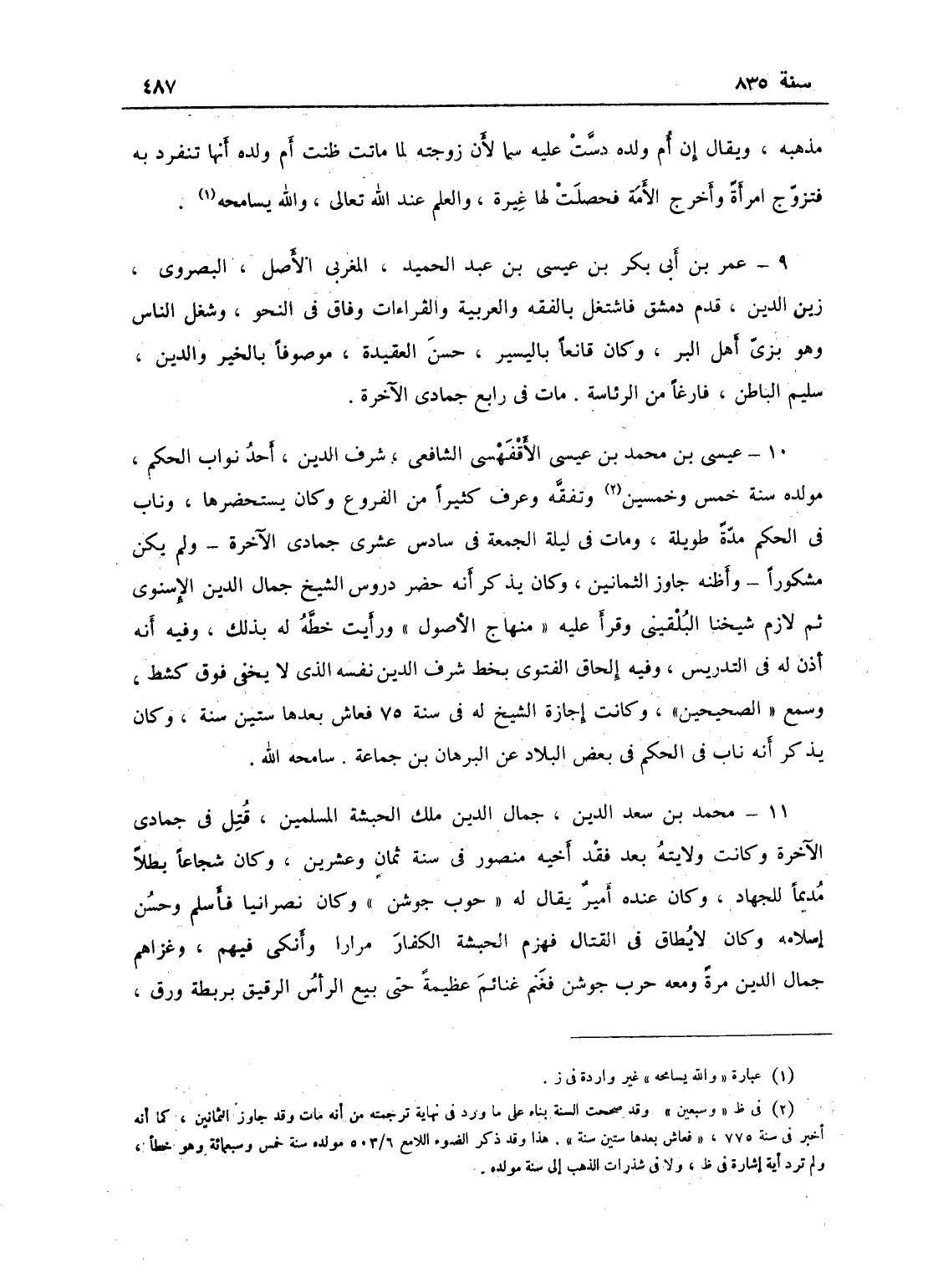 محمد بن سعد الدين، جمال الدين، ملك الحبشة المسلمين، قتل في جمادى الآخرة، وكانت ولايته بعد فقد أخيه منصور في سنة ثمان وعشرين، وكان شجاعاً بطلاً مديماً لجهاد وكان عنده أمير يقال له حرب جوس، كان نصرانياً فأسلم فحسن إسلامه، وكان لا يطاق في القتال، فهزم الحبشة الكفار مراراً وأنكأ فيهم، وغزاهم جمال الدين مرة ومعه حرب جوس فغنم غنائم عظيمة حتى بيع الرأس الرقيق بربطة ورق،