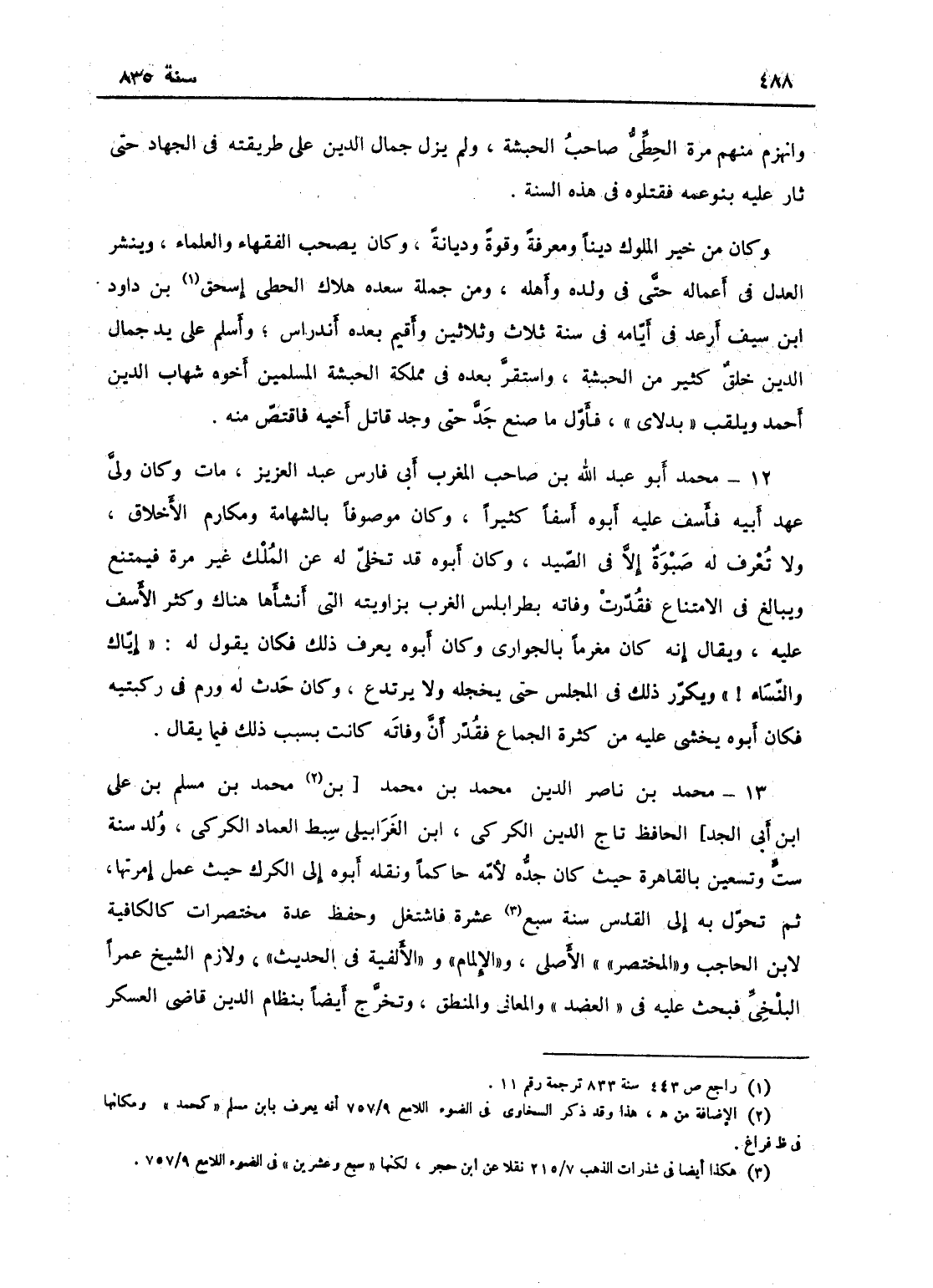 وانهزم منهم مرة الحطي صاحب الحبشة، ولم يزل جمال الدين على طريقته في الجهاد حتى ثار عليه بنو عمه فقتلوه في هذه السنة، وكان من خير الملوك ديناً ومعرفةً وقوةً وديانةً، وكان يصحب الفقهاء والصلحاء، وينشر العدل في أعماله حتى في ولده وأهله، ومن جملة سعده هلالك الحطي إسحاق بن داود بن سيف أرغد في أيامه في سنة ثلاث وثلاثين، وأقيم بعده اندراس، واسلم على يد جمال الدين خلائق من الحبشة، واستقر بعده في مملكة المسلمين أخوه شهاب الدين أحمد ويلقب بدلاي، فأول ما صنع جد حتى وجد قاتل أخيه فاقتص منه.