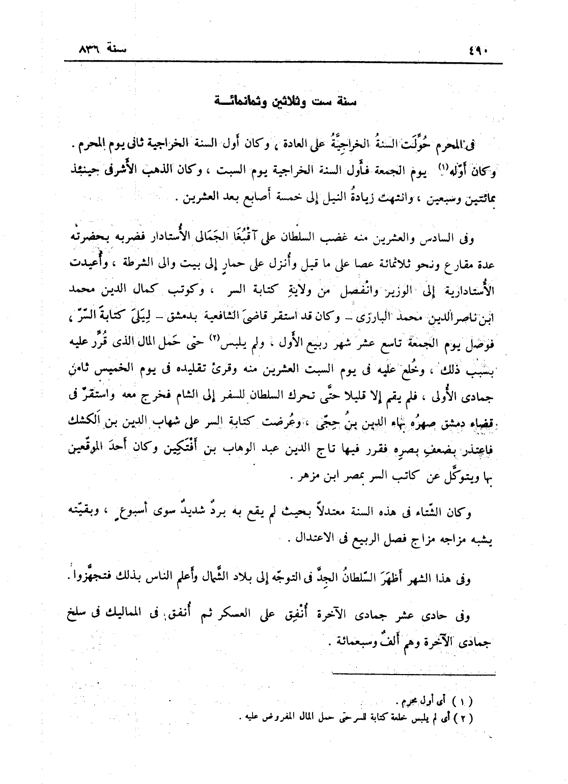 في المحرم حولت السنة الخراجية على العادة، وكان أول السنة الخراجية ثاني يوم المحرم، وكان أوله يوم الجمعة فأول السنة الخراجية يوم السبت، وكان الذهب الأشرفي حينئذ بمائتين وسبعين، وانتهت زيادة النيل إلى خمسة أصابع بعد العشري، وفي السادس والعشرين منه غضب السلطان على آقبغا الجمالي الأستادار وضربه بحضرته عدة مقارع ونحو ثلاثمائة عصا على ما قيل، وأنزل على حمار إلى بيت والي الشرطة وأعيدت الاستادراية إلى الوزير، وانفصل من ولاية كتابة السر، وكوتب جمال الدين محمد بن ناصر الدين محمد البازري وكان قد استقر قاضي الشافعية ليلى كتابة السر، فوصل في أول الجمعة تاسع عشر ربيع الأول، ولم يلبث حتى حمل المال الذي قرر عليه بسبب ذلك، وخلع عليه في يوم السبت العشرين منه، وقرئ تقليده في يوم الخميس ثامن جمادى الأولى، فلم يقم إلا قليلاً حتى تحرك السلطان للسفر إلى الشام فخرج معه، واستقر في قضاء دمشق صهره بهاء الدين ابن حجي، وعرضت كتابة السر على شهاب الدين ابن الكشك، فاعتذر بضعف بصره، فقرر فيها تاج الدين عبد الوهاب بن أفتكين وكان أحد الموقعين بها ويتوكل عن كاتب سر مصر ابن مزهر، وكان الشتاء في هذه السنة معتدلاً بحيث لم يقع به برد شديد سوى أسبوع، وبقيته يشبه مزاجه فصل الربيع في الاعتدال، وفي هذا الشهر أظهر السلطان الجد في التوجه إلى بلاد الشمال، وأعلم الناس بذلك فتجهزوا، وفي حادي عشر جمادى الآخرة أنفق على العسكر ثم أنفق في - المماليك السلطانية والأمراء في سلخ جمادى الآخرة - وهم ألف وسبعمائة.
