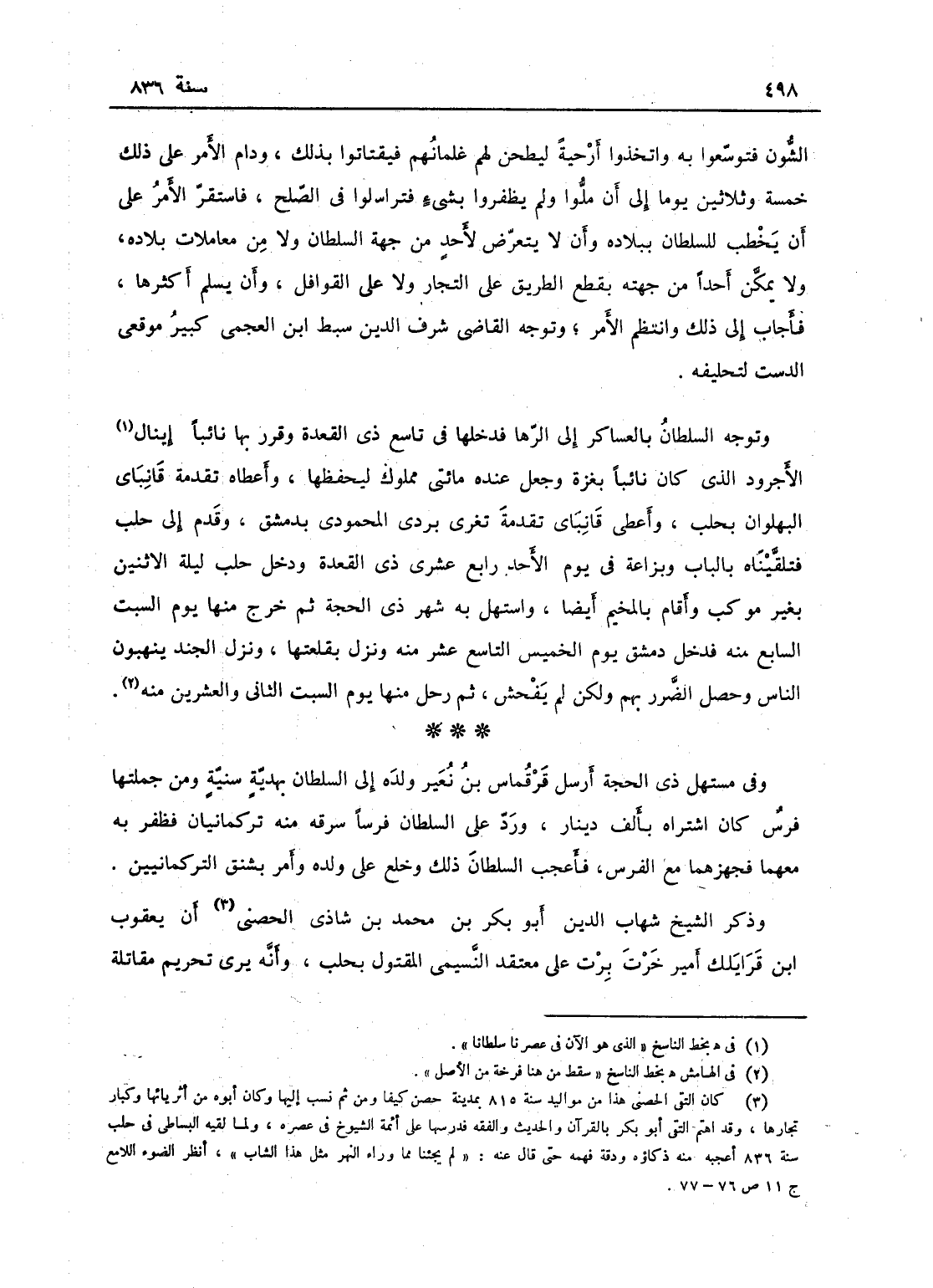 الشؤن فتوسعوا به، واتخذوا أرحية ليطحن لهم غلمانهم فيقتاتوا بذلك، ودام الأمر خمسة وثلاثين يوماً إلى أن ملوا ولم يظفروا بشيء فتراسلوا في الصلح، فاستقر الأمر على أن يخطب للسلطان ببلاده، وأن لا يتعرض لأحد من جهة السلطان ولا من معاملات بلاده، ولا يمكن أحداً من جهته يقطع طريق التجار ولا القوافل وأن يسلم أكثرها فأجاب إلى ذلك وانتظم الأمر، وتوجه القاضي شرف الدين سبط ابن العجمي كبير موقعي الدست لتحليفه فحلفه ورجع، وتوجه السلطان بالعساكر إلى الرها فدخلها في تاسع عشر ذي القعدة، وقرر بها نائباً اينال الأجرود الذي كان نائباً بغزة، وجعل عنده مائتي مملوك ليحفظها، وأعطاه تقدمة قانباي البهلوان بحلب، وأعطى قانباي تقدمة تغرى بردى المحمودي بدمشق وقدم إلى حلب، فتلقيناه بالباب وبزاعة في اليوم الأحد رابع عشري ذي القعدة، ودخل حلب في ليلة الاثنين بغير موكب، وأقام بالمخيم أيضاً، واستهل به شهر ذي الحجة، ثم خرج منها يوم السبت السابع منه، فدخل دمشق يوم الخميس التاسع عشر منه ونزل بقلعتها، ونزل الجند ينهبون الناس وحصل الضرر بهم ولكن لم يفحش، ثم رحل منها يوم السبت الثاني والعشرين منه، وفي مستهل ذي الحجة أرسل قرقماس بن نعير ولده إلى السلطان بهدية سنية، ومن جملتها فرس كان اشتراه بألف دينار، ورد على السلطان فرساً سرقه منه تركمانيان فظفر به معهما فجهزهما مع الفرس، فأعجب السلطان ذلك وخلع على ولده وأمر بشنق التركمانيين؛ وذكر الشيخ شهاب الدين أبو بكر بن محمد بن شادي الحصني أين يعقوب بن قرايلك أمير خرت برت على معتقد النسيمي المقتول بحلب، وأنه يرى تحريم معاملة