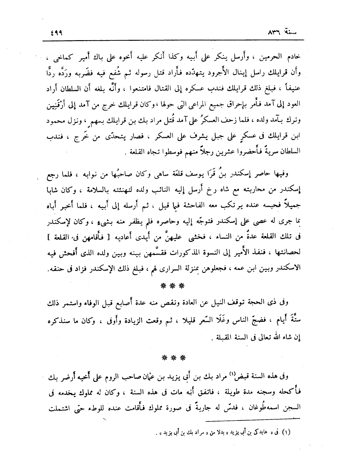 خادم الحرمين وأرسل ينكر على أبيه، وكذا أنكر عليه أخوه علي بك أمير كماخي، وأن قرا يلك راسل اينال الأجرود يتهدده، فأراد قتل رسوله ثم شفع فيه وضربه ورده رداً عنيفاً؛ فبلغ ذلك قرا يلك فندب عسكره إلى القتال فامتنعوا، وأنه بلغه أن السلطان أراد العود إلى آمد فأمر بإحراق جميع المراعي التي حولها وكان قرايلك خرج من آمد إلى أرمس وترك بآمد ولده، فلما زحف العسكر على آمد قتل مراد بك بن قرا يلك بسهم، ونزل محمود بن قرا يلك في عسكر على جبل مشرف على العسكر فصار يتحدى من خرج، فندب السلطان سرية فأحضروا عشرين رجلاً منهم فوسطوا تجاه القلعة.