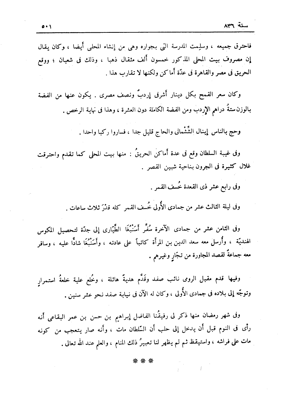 فاحترق جميعه وسلمت المدرسة التي بجواره وهي من إنشاء المحلي أيضاً، وكان يقال إن مصروف بيت المحلي المذكور خمسون ألف مثقال ذهباً، وذلك في شعبان، ووقع الجريق في مصر والقاهرة في عدة أماكن لكنها لا يقارب هذا، وكان سعر القمح بكل دينار أشرفي إردب ونصف مصري يكون ثمنها من الفضة بالوزن ستة دراهم الإردب، ومن الفضة الكاملة دون العشرة وهذا في نهاية الرخص، وحج بالناس أينال الششماني والحاج قليل جداً فساروا ركباً واحداً، وفي غيبة السلطان وقع في عدة أماكن الحريق، منها بيت المحلي كما تقدم، واحترقت غلال كثيرة في الجرون بناحية شيبين القصر.