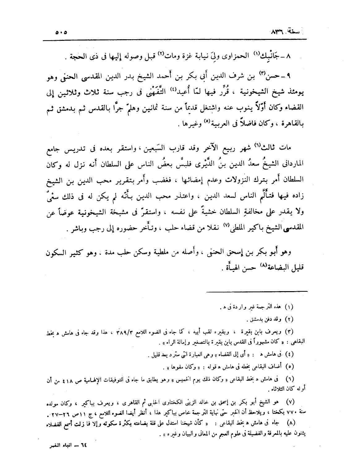 حسن بن شرف الدين أبي بكر بن أحمد، الشيخ بدر الدين القدسي الحنفي وهو يومئذ شيخ الشيخونية، قرر فيها لما أعيد التفهني في رجب سنة 33 إلى القضاء وكان أولاً ينوب عنه، واشتغل قديماً من سنة ثمانين وهلم جراً بالقدس ثم بدمشق ثم بالقاهرة، وكان فاضلاً في العربية وغيرها؛ مات ثالث ربيع الآخر وكان ذلك يوم الخميس - وقد قارب السبعين، واستقر بعده في تدريس جامع المارداني الشيخ سعد الدين ابن الديري فلبس بعض الناس على السلطان أنه نزل له، وكان السلطان أمر بترك النزولات وعدم إمضائها، فغضب وأمر بتقرير محب الدين بن الشيخ زاده فيها، فتالم الناس لسعد الدين، واعتذر محب الدين بأنه لم يكن له في ذلك سعي ولا يقدر على مخالفة السلطان خشية على نفسه، واستقر في مشيخة الشيخونية عوضاً عن القدسي الشيخ باكير الملطي نقلاً من قضاء حلب، وتأخر حضوره إلى رجب، وباشر، وهو أبو بكر بن إسحاق الحنفي وأصله من ملطية وسكن حلب مدة، وهو كثير السكوت، قليل البضاعة، حسن الهيئة.