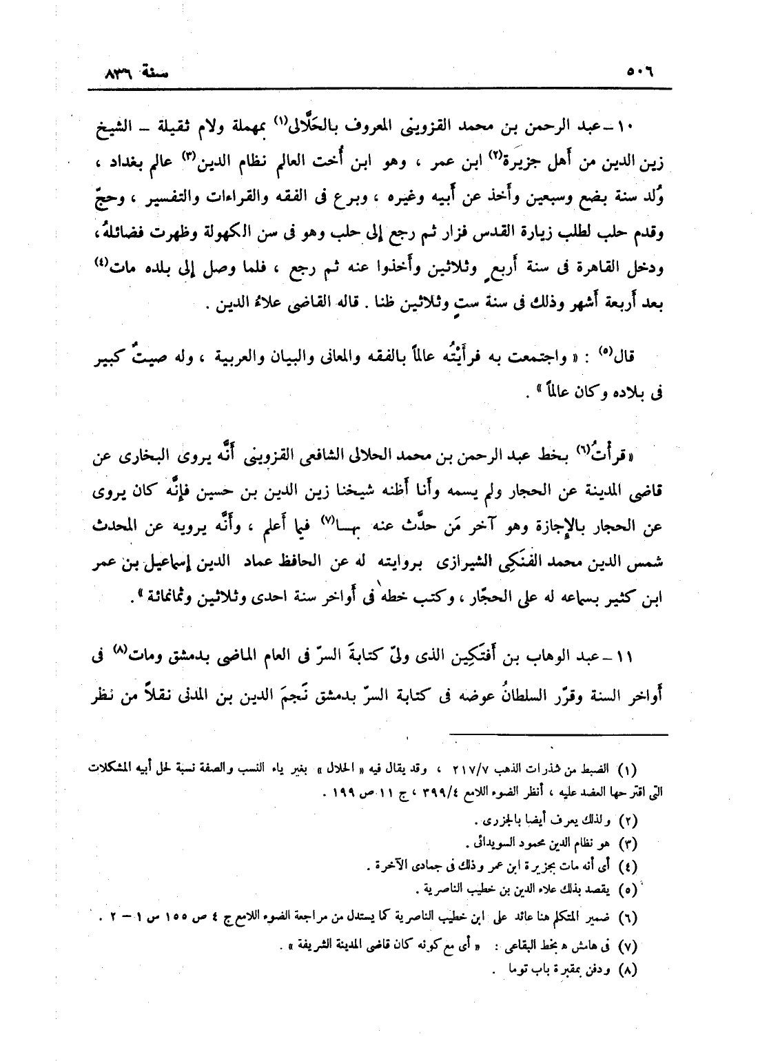 عبد الرحمن بن محمد، القزويني المعروف بالحلالي - بمهملة ولام وثقيلة - الشيخ زين الدين من أهل جزيرة ابن عمر، وهو ابن أخت العالم نظام الدين عالم بغداد، ولد سنة بضع وسبعين، وأخذ عن أبيه وغيره، وبرع في الفقه والقراآت والتفسير، وحج، وقدم حلب لطلب زيارة القدس فزار، ثم رجع إلى حلب وهو في سن الكهولة وظهرت فضائله، ودخل القاهرة في سنة 34 وأخذوا عنه ثم رجع؛ فلما وصل إلى بلده مات بعد أربعة اشهر، وذلك في سنة ست وثلاثين ظناً - قاله القاضي علاء الدين قال: واجتمعت به فرأيته عالماً بالفقه والمعاني والبيان والعربية، وله صيت كبير في بلاده وكان عالمها، قرأت بخط عبد الرحمن بن محمد الحلالي الشافعي القزويني أنه يروى البخاري عن قاضي المدينة عن الحجار ولم يسمه، وأنا أظنه شيخنا زين الدين ابن حسين، فإنه كان يروي عن الحجار بالإجازة وهو آخر من حدث عنه بها فيما أعلم وأنه يرويه عن المحدث شمس الدين ابن كثير بسماعه له على الحجار، وكتب خطه في أواخر سنة 831.