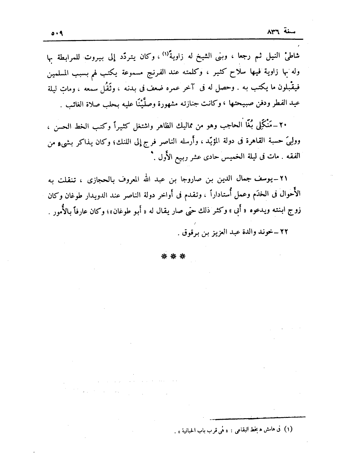 منكلى بغا الحاجب وهو من مماليك الظاهر، اشتغل كثيراً، وكتب الخط الحسن، وولي حسبة القاهرة في دولة المؤيد، وأرسله الناصر فرج إلى اللنك، وكان يذاكر بشئ من الفقه؛ مات - في ليلة الخميس - في حادى عشر ربيع الأول.