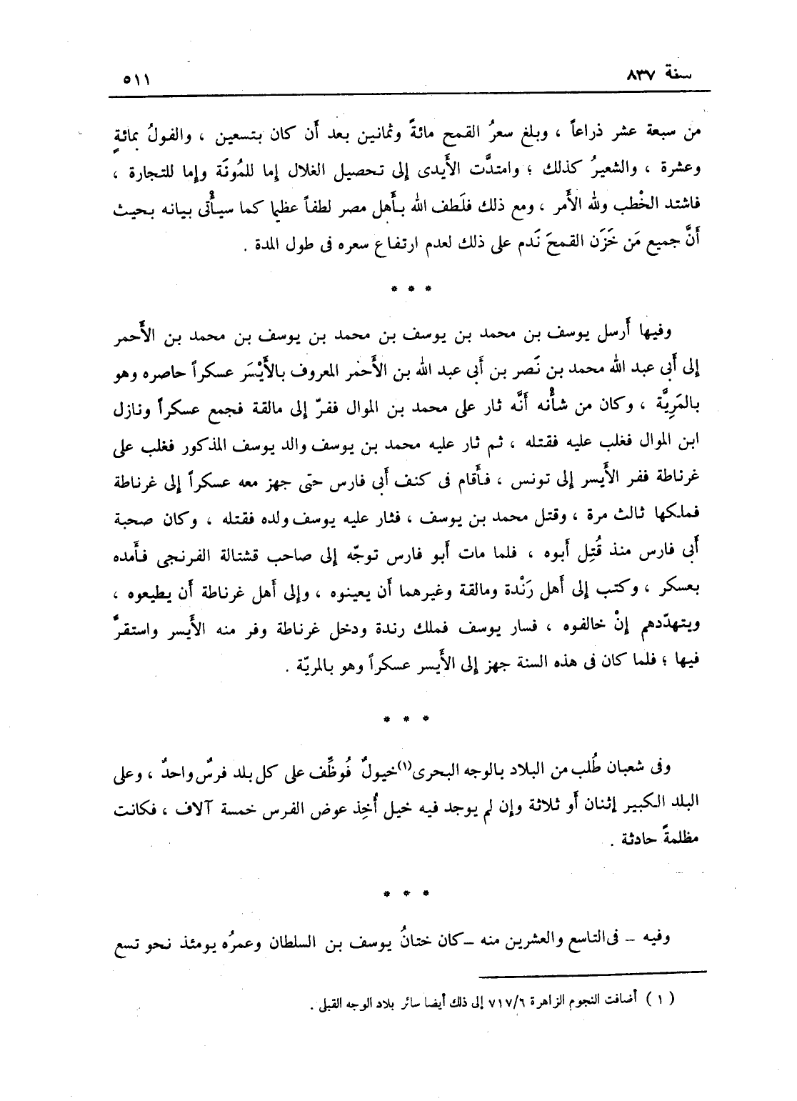 من سبعة عشر ذراعاً، وبلغ سعر القمح مائة وثمانين بعد أن كان بتسعين، والفول بمائة وعشرة، والشعير كذلك، وامتدت الأيدي إلى تحصيل الغلال إما للمؤنة وإما للتجارة فاشتد الخطب - ولله الأمر! ومع ذلك فلطف الله بأهل مصر لطفاً عظيماً كما سيأتي بيانه بحيث أن جميع من خزن القمح ندم على ذلك لعدم إرتفاع سعره في طول المدة، وفيها أرسل يوسف بن محمد بن يوسف ابن محمد بن يوسف بن محمد بن الأحمر إلى أبي عبد الله محمد بن نصر بن أبي عبد الله بن الأحمر المعروف بالأيسر عسكراً حاصره وهو بالمرية، وكان من شأنه أنه ثار على محمد بن الموال ففر إلى مالقة فجمع عسكراً ونازل ابن الموال فغلب عليه فقتله، ثم ثار عليه محمد بن يوسف والد يوسف المذكور فغلب على غرناطة، ففر الأيسر إلى تونس فأقام في كنف أبي فارس حتى جهز معه عسكراً إلى غرناطة، فملكها ثالث مرة وقتل محمد بن يوسف، فثار عليه يوسف ولده فقتله وكان صحبة أبي فارس منذ قتل أبوه، فلما مات أبو فارس توجه إلى صاحب فنشالة الفرنجي فأمده بعسكر، وكتب إلى أهل رندة ومالقة وغيرها أن يعينوه، وإلى أهل غرناطة أن يطيعوه، وتهددهم إن خالفوه، فسار يوسف فملك رندة ودخل غرناطة وفر منه الأيسر واستقر فيها، فلما كان في هذه السنة جهز إلى الأيسر عسكراً وهو بالمرية.