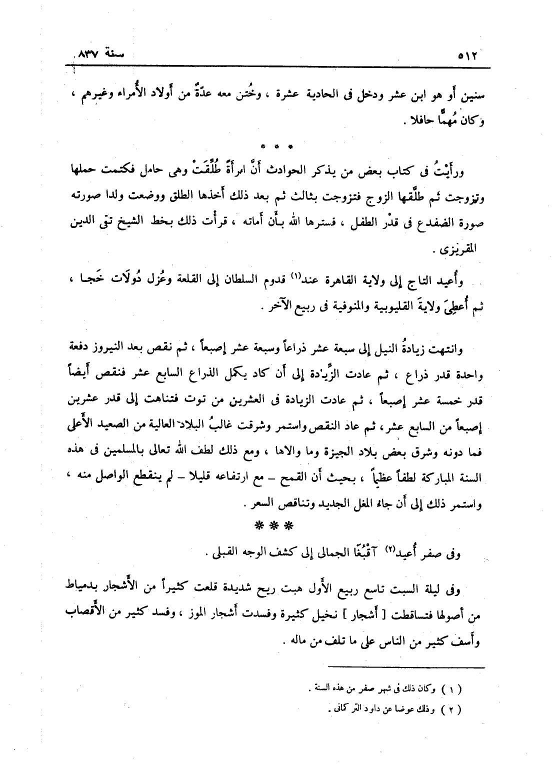 سنين، أو هو ابن عشر ودخل في الحادية عشرة، وختن معه عدة من أولاد الأمراء وغيرهم، وكان مهماً حافلاً؛ ورأيت في كتاب بعض من يذكر الحوادث أن امرأة طلقت وهي حامل فكتمت حملها وتزوجت، ثم طلقها الزوج فتزوجت بثالث ثم بعد ذلك أخذها الطلق ووضعت ولداً صورته صورة الضفدع في قدر الطفل، فسترها الله بأن أماته - قرأت ذلك بخط الشيخ تقي الدين المقريزي، وأعيد التاج إلى ولاية القاهرة عند قدوم السلطان إلى القلعة وعزل دولات خجا، ثم أعطى ولاية القليوبية والمنوفية في ربيع الآخر، وانتهت زيادة النيل إلى سبعة عشر ذراعاً وسبعة عشر إصبعاً، ثم نقص بعد النيروز دفعة واحدة قدر ذراع ثم عادت الزيادة إلى أن كاد يكمل السابع عشر، فنقص أيضاً قدر خمسة عشر إصبعاً، ثم عادت الزيادة في العشرين من توت فتناهت إلى قدر عشرين إصبعاً من السابع عشر، ثم عاد النقص واستمر وشرقت غالب البلاد العالية من الصعيد الأعلى فما دونه، وشرق بعض بلاد الجيزة وما والاها، ومع ذلك لطف الله تعالى بالمسلمين في هذه السنة المباركة لطفاً عظيماً بحيث أن سعر القمح مع ارتفاعه قليلاً لم ينقطع الواصل منه، واستمر ذلك إلى أن جاء المغل الجديد وتناقص السعر، وفي صفر أعيد آقبغا الجمالي إلى كشف الوجه القبلي، وفي ليلة السبت تاسع ربيع الأول هبت ريح شديدة قلعت كثيراً من الأشجار بدمياط من أصولها، فتساقطت نخيل كثيرة وفسدت أشجار الموز، وفسد كثير من الأقصاب، وأسف كثير من الناس على ما تلف من ماله،
