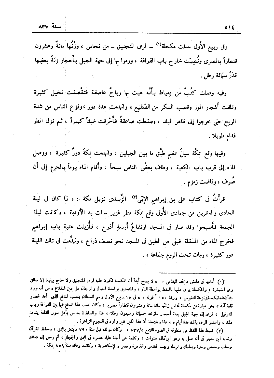 وفيها وقع بمكة سيل عظيم طبق ما بين الجبلين، وانهدمت بمكة دور كثيرة، ووصل الماء إلى قرب باب الكعبة، وطاف بعض الناس سبحاً، وأقام الماء يوماً بالحرم إلى أن صرف، وفاضت زمزم إلى أن شرع الماء بها هدراً قرأت في كتاب علي بن إبراهيم الأبي الزبيدي نزيل مكة لما كان في ليلة الحادي والعشرين من جمادى الأولى وقع بمكة مطر غزير سالت منه الأودية وكانت ليلة الجمعة، فأصبحوا وقد صار في المسجد ارتفاع أربعة أذرع - ماء -، فأزيلت عتبة باب إبراهيم فخرج الماء من المسفلة، فبقى من الطين في المسجد نحو نصف ذراع، وتهدمت في تلك الليلة دور كثيرة، ومات تحت الردم جماعة،