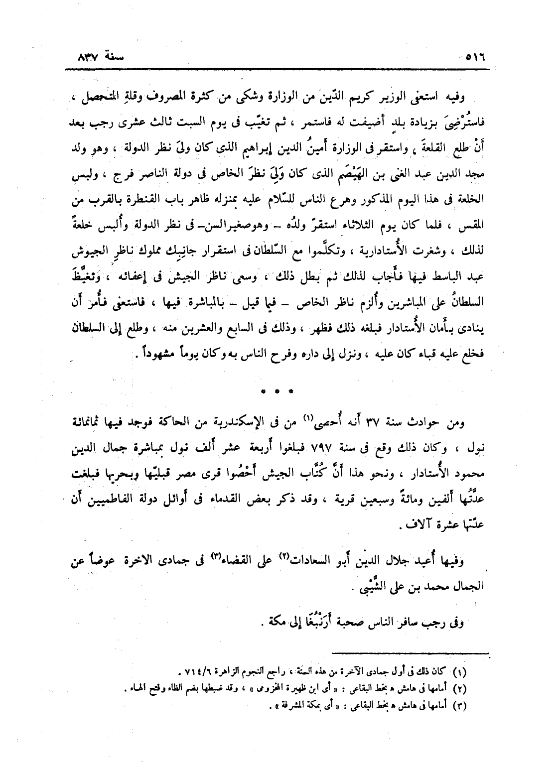 وفيه استعفى الوزير كريم الدين من الوزارة وشكا من كثرة المصروف وقلة المتحصل، فاسترضى بزيادة بلد أضيفت له فاستمر، ثم تغيب في يوم السبت ثالث عشرى رجب بعد أن طلع القلعة، واستقر في الوزارة أمين الدين إبراهيم الذي كان ولي نظر الدولة، وهو ولد مجد الدين عبد الغني ابن الهيصم الذي كان ولي نظر الخاص في دولة الناصر فرج، ولبس الخلعة في هذا اليوم المذكور، وهرع الناس للسلام عليه بمنزله ظاهر باب القنطرة بالقرب من الميس، فلما كان يوم الثلاثاء استقر ولده وهو صغير السن في نظر الدولة، وألبس خلعة لذلك وشغرت الأستادارية، وتكلموا مع السلطان في استقرار جانبك مملوك ناظر الجيوش عبد الباسط فيها فأجاب لذلك، ثم بطل ذلك وسعى ناظر الجيش في إعفائه، - وتغيظ السلطان على المباشرين، وألزم ناظر الخاص فيما قيل بالمباشرة فيها، واستعفى - فأمر أن ينادي بأمان الأستادار، فبلغه ذلك فظهر، وذلك في السابع والعشرين منه، وطلع إلى السلطان، فخلع عليه قباء كان عليه، ونزل إلى داره وفرح الناس - به - وكان يوماً مشهوداً - تم في.... -، ومن حوادث سنة 37 أنه أحصى من في الإسكندرية من الحاكة فوجد فيها ثمانمائة نول، وكان ذلك وقع في سنة 797، فبلغوا أربعة عشر ألف نول بمباشرة جمال الدين محمود الأستادار، ونحو هذا أن كتاب الجيش أحصوا قرى مصر قبلها وتحررها، فبلغت عدتها ألفين ومائة وسبعين قرية؛ وقد ذكر بعض القدماء في أوائل دولة الفاطميين أن عدتها عشرة آلاف.