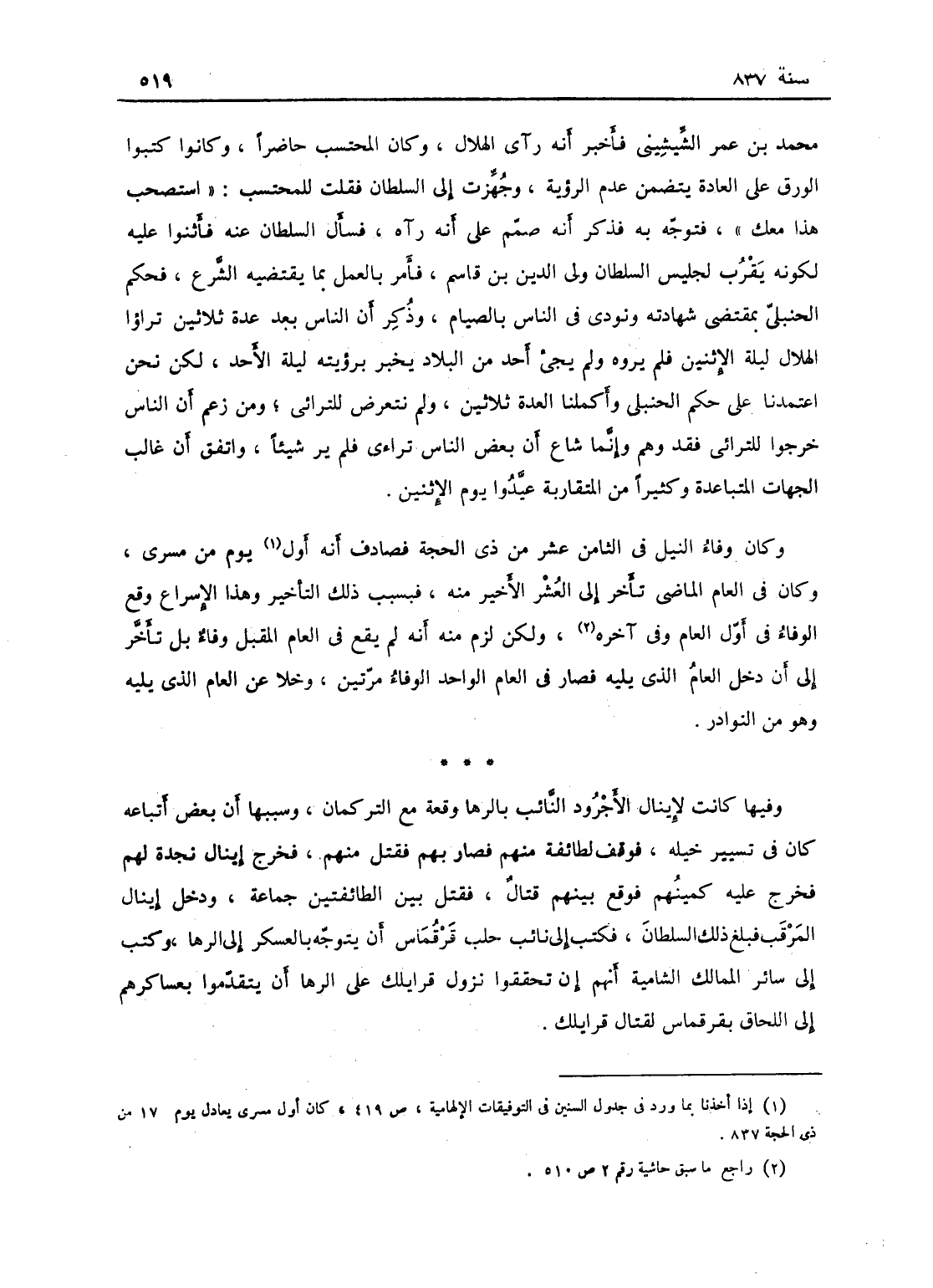 وكان وفاء النيل في الثامن عشر من ذي الحجة، وصادف أنه أول يوم من مسرى وكان في العام الماضي تأخر إلى العشر الأخير منه، فبسبب ذلك التأخير وهذا الإسراع وقع الوفاء في أول العام وفي آخره، ولكن لزم منه أنه لم يقع في العام المقبل وفاء بل تأخر إلى أن دخل العام الذي يليه، فصار كالعام الوفاء مرتين وخلا عن العام الذي يليه، وهو من النوادر.