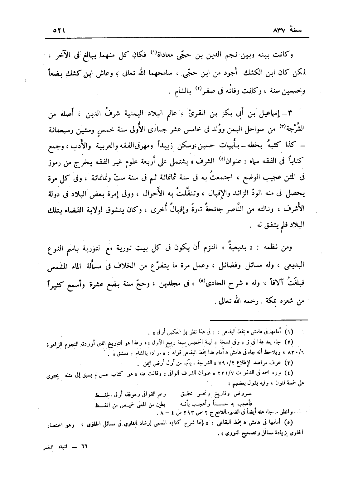 إسماعيل بن أبي بكر بن المقرئ عالم البلاد اليمنية، شرف الدين أصله من الشرجة من سواحل اليمن، وولد سنة خمس وستين وسبعمائة بأبيات حسين، وسكن زبيد، ومهر في الفقه والعربية والأدب، وجمع كتاباً في الفقه سماه عنوان الشرف، يشتمل على أربعة علوم غير الفقه، يخرج من رموز في المتن عجيب الوضع، اجتمعت به في سنة ثمانمائة ثم في سنة ست وثمانمائة، وفي كل مرة يحصل لي منه الود الزائد والإقبال، وتنقلت به الأحوال، وولي إمرة بعض البلاد في دولة الأشرف، ونالته من الناصر جائحة تارة وإقبال أخرى، وكان يتشوف لولاية القضاء بتلك البلاد فلم يتفق له. ومن نظمه بديعية التزم أن تكون في كل بيت تورية مع التورية باسم النوع البديعي، وله مسائل وفضائل، وعمل مرة ما يتفرع من الخلاف في مسألة الماء المشمس فبلغت آلافا، وله شرح - مختصر - الحاوي في مجلدين، وحج سنة بضع عشرة، وأسمع كثيراً من شعره بمكة رحمه الله تعالى.