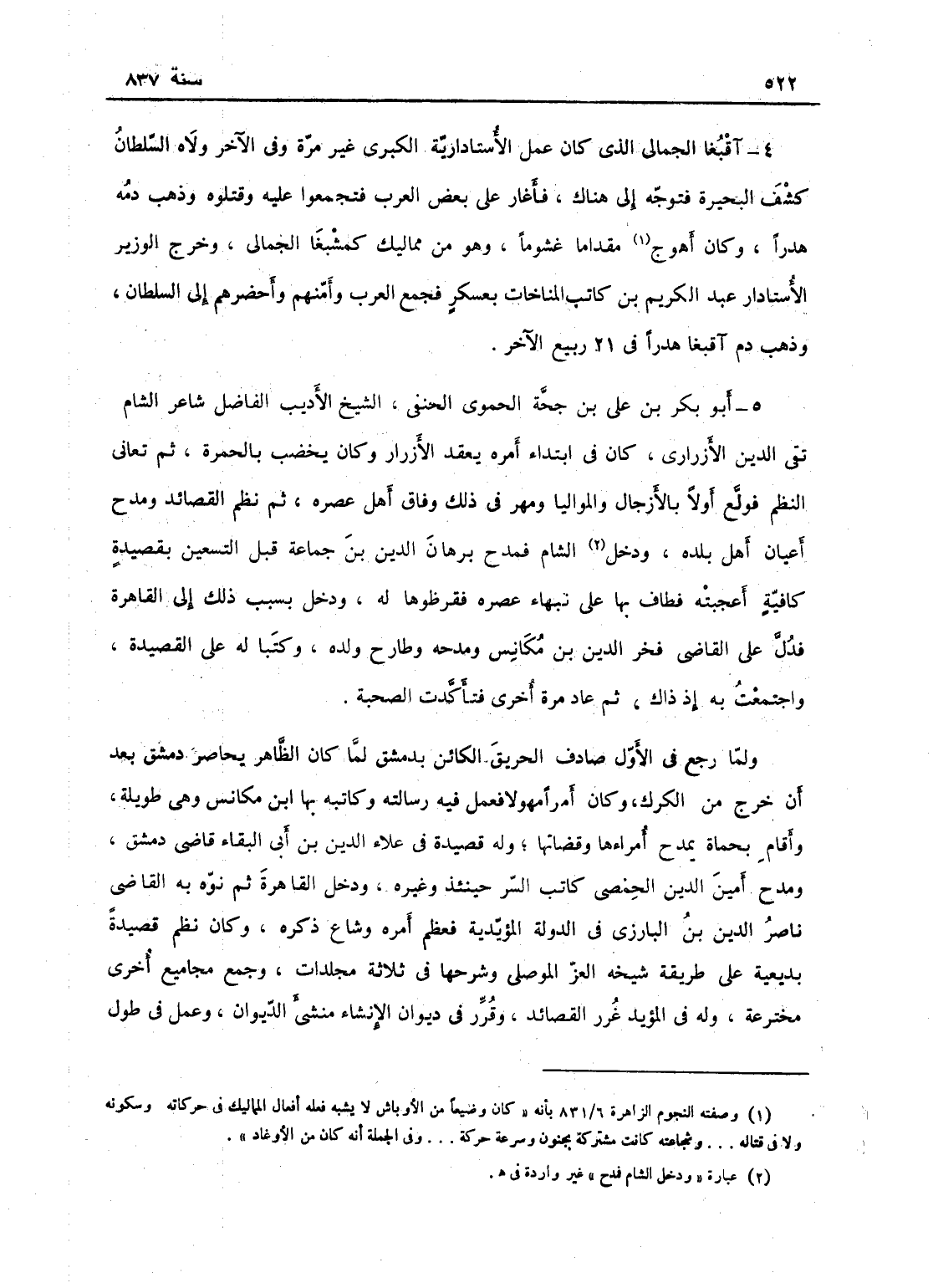 واجتمعت به إذ ذاك، ثم عاد مرة أخرى فتأكدت الصحبة، ولما رجع في الأول صادف الحريق الكائن بدمشق لما كان الظاهر يحاصر دمشق بعد أن خرج من الكرك وكان أمراً مهولاً، فعمل فيه رسالة وكاتب بها ابن مكانس وهي طويلة، وأقام بحماة يمدح أمراءها وقضاتها، وله قصيدة في علاء الدين ابن أبي البقاء قاضي دمشق، ومدح أمين الدين الحمصي كاتب السر حينئذ وغيره ودخل القاهرة، ثم نوه به القاضي ناصر الدين البارزي في الدولة المؤيدية فعظم أمره وشاع ذكره، وكان نظم قصيدة بديعية على طريقة شيخه المعز الموصلي وشرحها في ثلاث مجلدات، وجمع مجاميع أخرى مخترعة وله في المؤيد غرر القصائد وقرر في ديوان الإنشاء منشئ الديوان، وعمل في طول