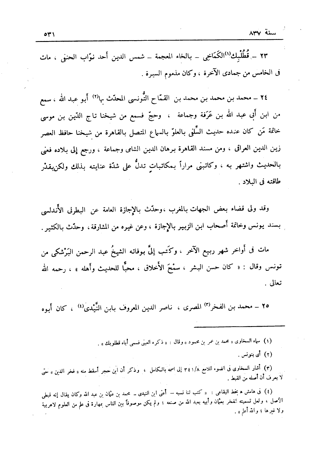 محمد بن محمد بن محمد بن القماح، التونسي المحدث بها أبو عبد الله، سمع من أبي عبد الله بن عرفة وجماعة وحج فسمع من شيخنا تاج الدين ابن موسى خاتمة من كان عنده حديث السلفي بالعلو بالسماع المتصل بالقاهرة من شيخنا حافظ العصر زين الدين العراقي ومن مسند القاهرة برهان الدين السامي وجماعة، ورجع إلى بلاده فعنى بالحديث واشتهر به وكاتبني مراراً بمكاتبات تدل على شدة عنايته بذلك ولكن بقدر طاقته في البلاد، وقد ولي قضاء بعض الجهات بالمغرب، وحدث بالإجازة العامة عن البطرني الأندلسي مسند تونس وخاتمة أصحاب ابن الزبير بالإجازة وعن غيره من المشارقة وحدث بالكثير؛ مات في أواخر شهر ربيع الآخر، كتب إلي بوفاته الشيخ عبد الرحمن البرشكي من تونس وقال: كان حسن البشر سمح الأخلاق محباً للحديث وأهله - رحمه الله تعالى.