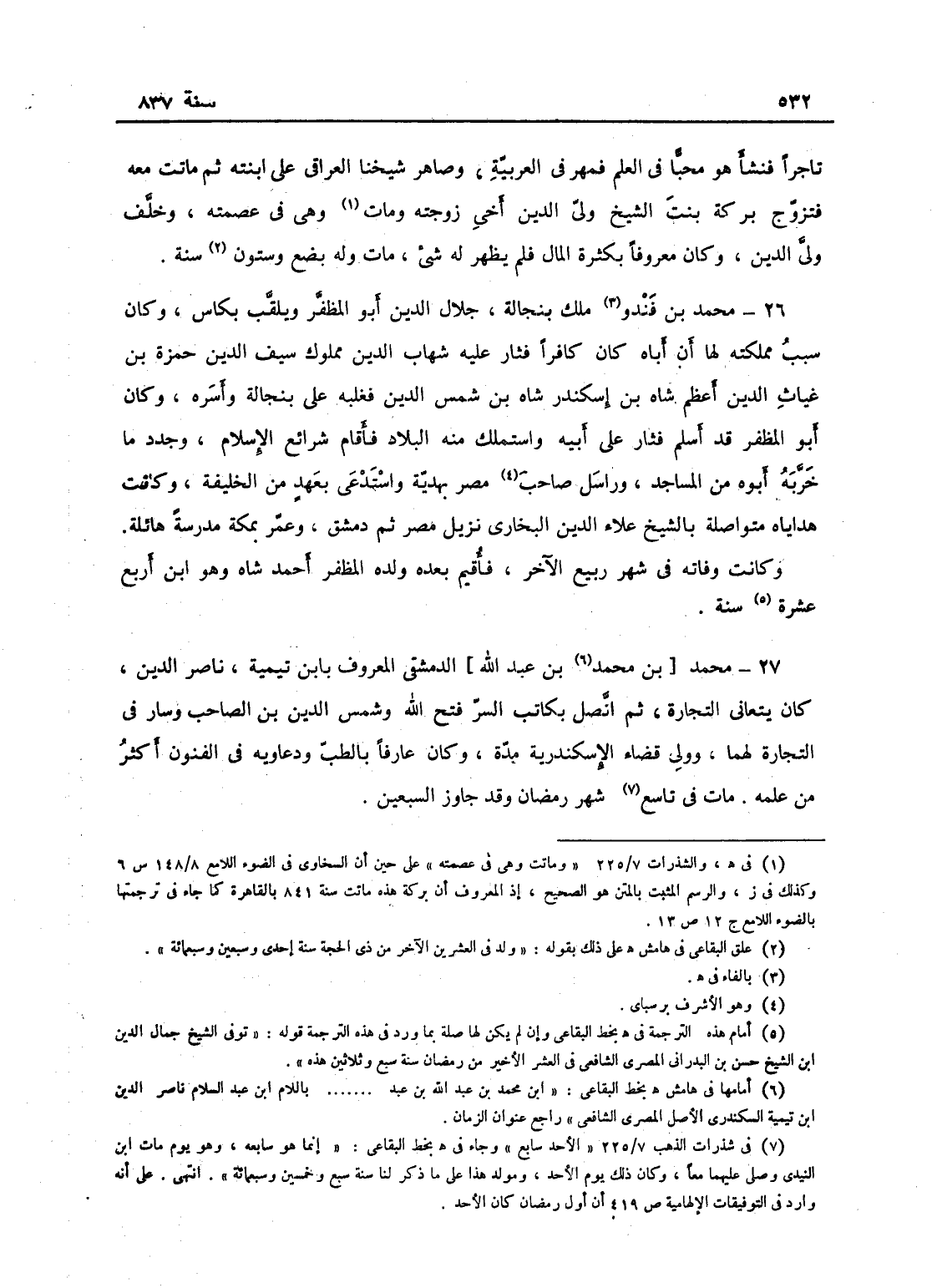 محمد بن فندو ملك بنجالة جلال الدين أبو المظفر ويلقب بكاس، وكان سبب تملكه لها أن أباه كان كافراً فثار على شهاب الدين مملوك سيف الدين حمزة بن غياث الدين أعظم شاه بن إسكندر شاه بن شمس الدين، فغلبه على بنجالة وأسره، وكان أبو المظفر قد اسلم فثار على أبيه واستملك منه البلاد، وأقام شعار الإسلام، وجدد ما خربه أبوه من المساجد، وراسل صاحب مصر بهدية، واستدعى بعهد من الخليفة وكانت هداياه متواصلة بالشيخ علاء الدين البخاري نزيل مصر ثم دمشق، وعمر بمكة مدرسة هائلة، وكانت وفاته في شهر ربيع الآخر، واقيم بعده ولده المظفر أحمد شاه وهو ابن أربع عشرة سنة.