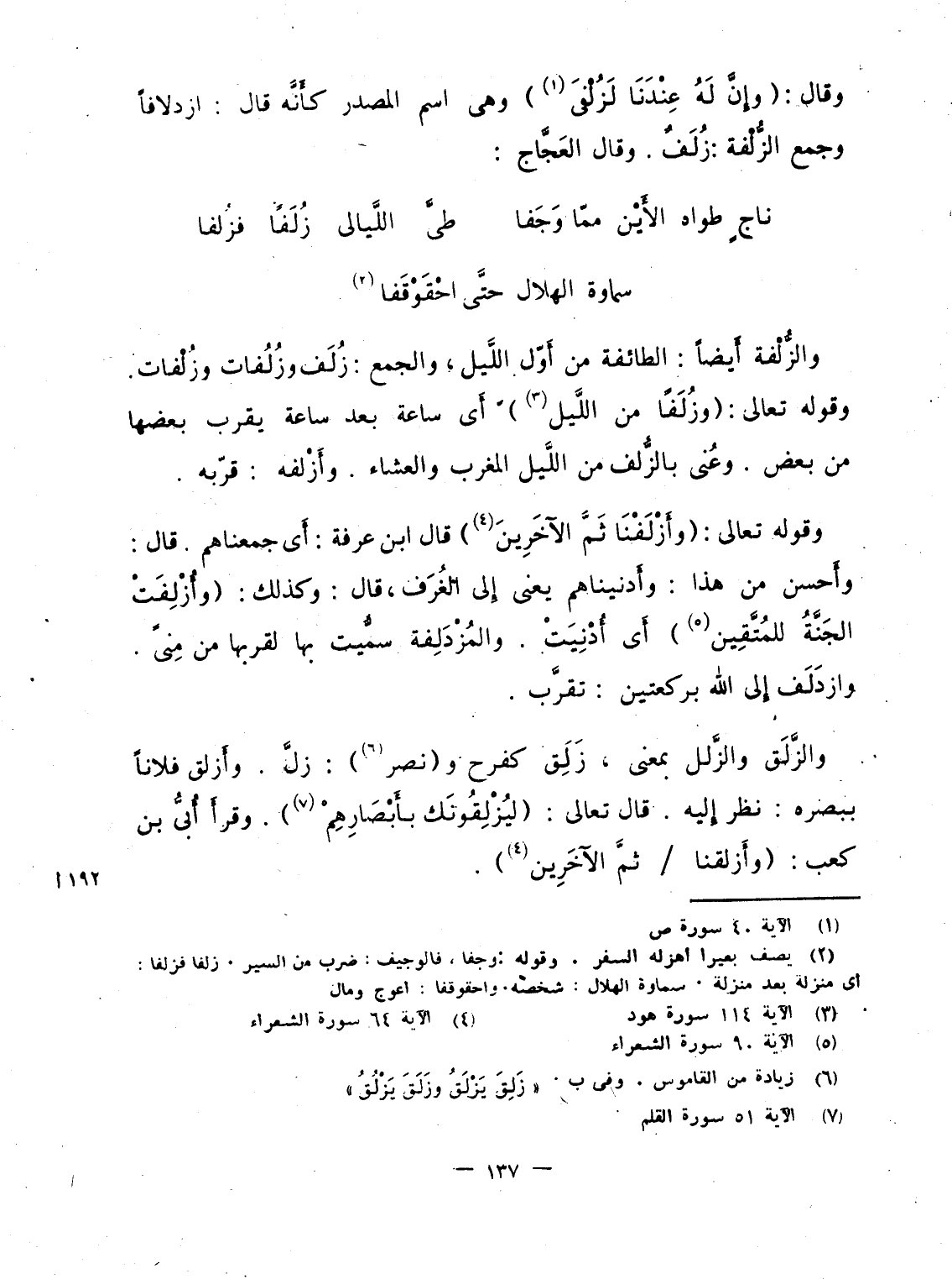 وقال: {وَإِنَّ لَهُ عِندَنَا لزلفى} وهى اسم المصدر كأَنَّه قال: ازدلافاً. وجمع الزُّلْفة: زُلَفٌ. وقال العَجَّاج: