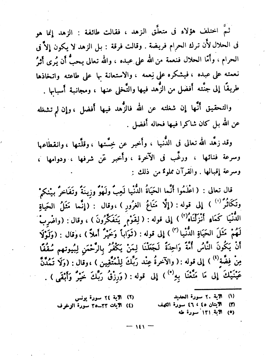 ثمَّ اختلف هؤلاء فى متعلَّق الزهد، فقالت طائفة: الزهد إِنما هو فى الحلال لأَن ترك الحرام فريضة. وقالت فرقة: بل الزهد لا يكون إِلاَّ فى الحرام، وأَمّا الحلال فنعمة من الله على عبده، والله تعالى يحبُّ أَن يُرى أَثرُ نعمته على عبده، فيشكره على نِعمه، والاستعانة بها على طاعته واتخاذها طريقًا إِلى جنَّته أَفضل من الزُّهد فيها والتَّخلى عنها، ومجانبة أَسبابها.