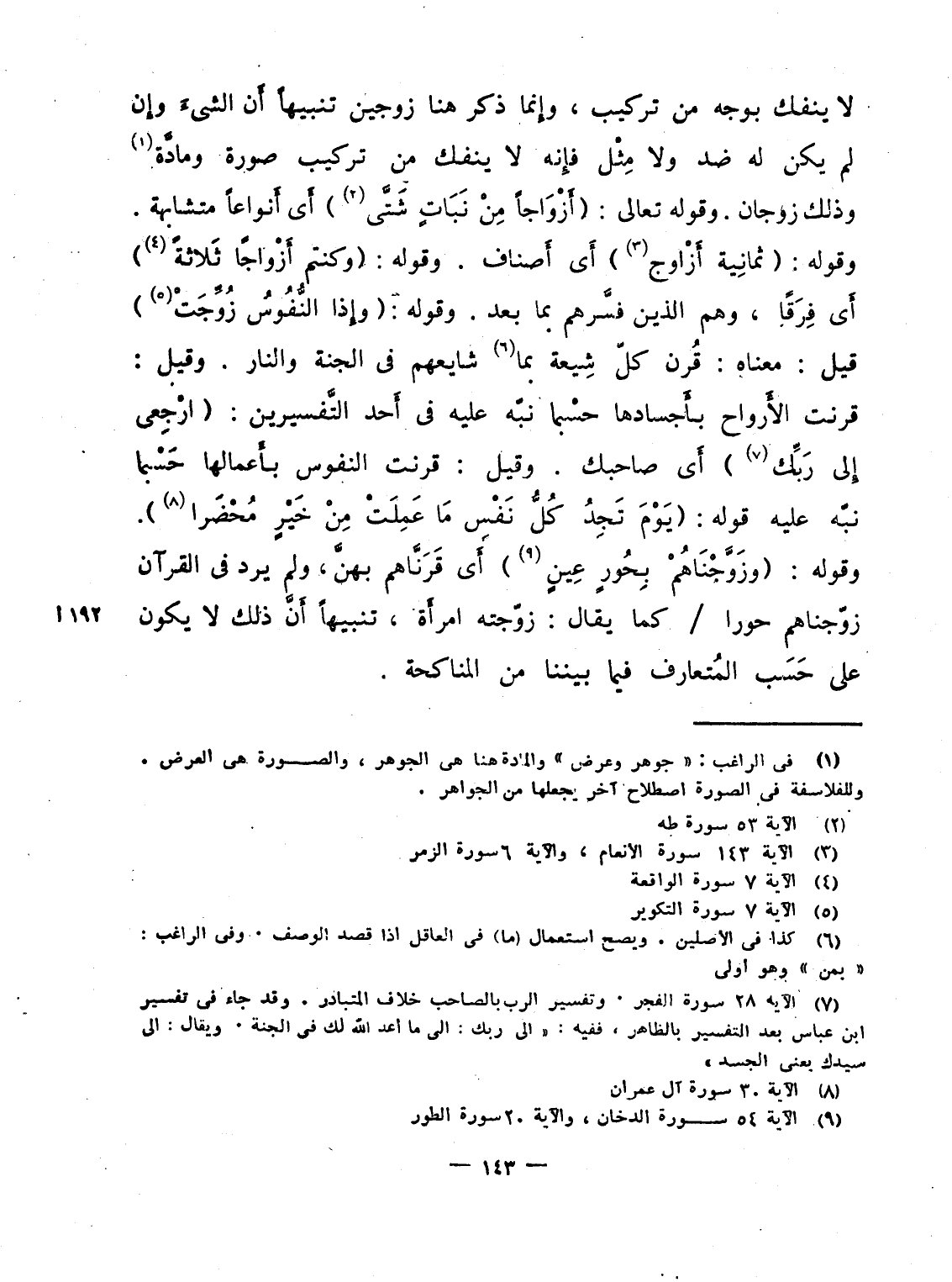 لا ينفك بوجه من تركيب، وإِنما ذكر هنا زوجين تنبيهاً أَن الشىءَ وإِن لم يكن له ضد ولا مِثْل فإِنه لا ينفك من تركيب صورة ومادَّة وذلك زوجان. وقوله تعالى: {أَزْوَاجاً مِّن نَّبَاتٍ شتى} أَى أَنواعاً متشابهة. وقوله: {ثَمَانِيَةَ أَزْوَاجٍ} أَى أَصناف. وقوله: {وَكُنتُمْ أَزْوَاجاً ثَلاَثَةً} أَى فِرَقًا، وهم الذين فسَّرهم بما بعد. وقوله: {وَإِذَا النفوس زُوِّجَتْ} قيل: معناه: قُرن كلّ شِيعة بما شايعهم فى الجنة والنار. وقيل: قرنت الأَرواح بأَجسادها حسْبما نبّه عليه فى أَحد التَّفسيرين: {ارجعي إلى رَبِّكِ} أَى صاحبك. وقيل: قرنت النفوس بأَعمالها حَسْبما نبّه عليه قوله: {يَوْمَ تَجِدُ كُلُّ نَفْسٍ مَّا عَمِلَتْ مِنْ خَيْرٍ مُّحْضَراً} . وقوله: {وَزَوَّجْنَاهُم بِحُورٍ عِينٍ} أَى قَرَنَّاهم بهنَّ، ولم يرد فى القرآن زوّجناهم حورا / كما يقال: زوّجته امرأَة، تنبيهاً أَنَّ ذلك لا يكون على حَسَب المُتعارف فيما بيننا من المناكحة.