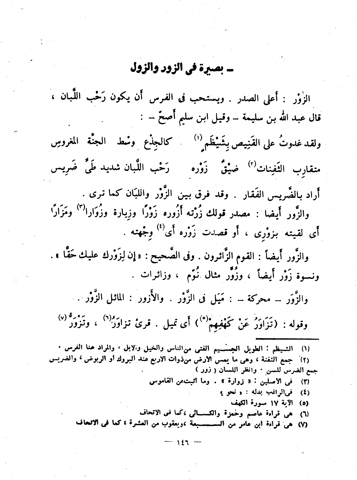 الزوْر: أَعلى الصدر. ويستحب فى الفرس أَن يكون رَحْب اللَّبان، قال عبد الله بن سليمة - وقيل ابن سليم أَصحّ -: