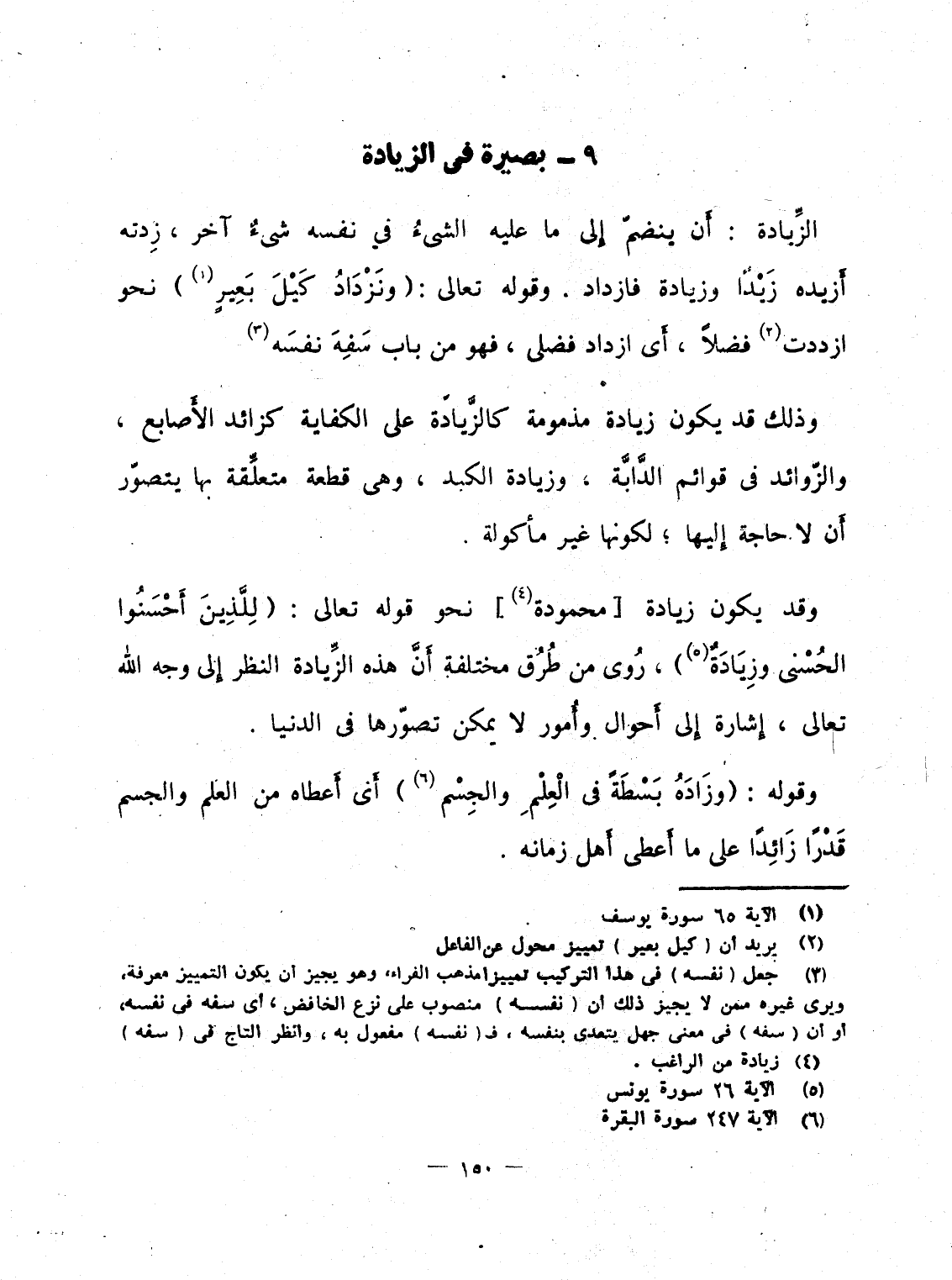 وقد يكون زيادة [محمودة] نحو قوله تعالى: {لِّلَّذِينَ أَحْسَنُواْ الحسنى وَزِيَادَةٌ} ، رُوى من طُرُق مختلفة أَنَّ هذه الزِّيادة النظر إِلى وجه الله تعالى، إشارة إِلى أَحوال وأُمور لا يمكن تصوّرها فى الدنيا.
