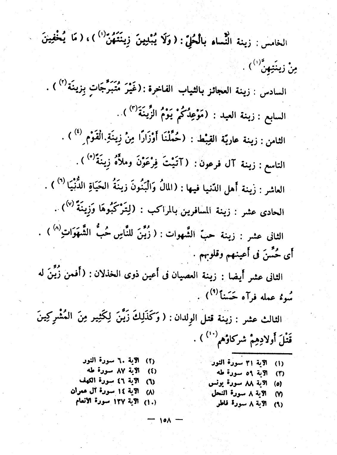 الخامس: زينة النّساء بالْحُلِىّ: {وَلاَ يُبْدِينَ زِينَتَهُنَّ} ، {مَا يُخْفِينَ مِن زِينَتِهِنَّ} .
