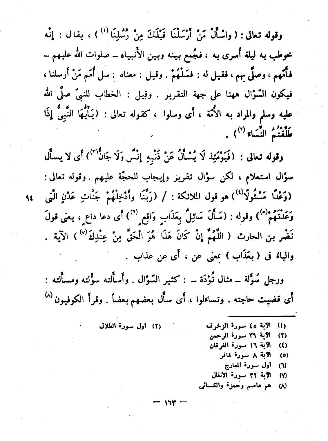 وقوله تعالى: {وَسْئَلْ مَنْ أَرْسَلْنَا مِن قَبْلِكَ مِن رُّسُلِنَآ} ، يقال: إِنّه خوطب به ليلة أُسرى به، فجُمع بينه وبين الأَنبياءِ - صلوات الله عليهم - فأَمّهم، وصلَّى بهم، فقيل له: فسَلْهُمْ. وقيل: معناه: سل أُمَم مَنْ أَرسلنا، فيكون السّؤال ههنا على جهة التقرير. وقيل: الخطاب للنبىّ صلَّى الله عليه وسلم والمراد به الأُمَة، أَى وسلوا، كقوله تعالى: {ياأيها النبي إِذَا طَلَّقْتُمُ} .