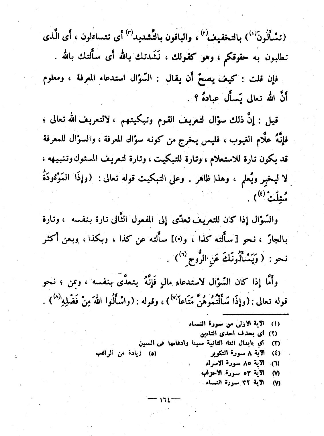 فإِن قلت: كيف يصحّ أَن يقال: السّؤال استدعاء المعرفة، ومعلوم أَنَّ الله تعالى يَسأَل عبادهُ؟.