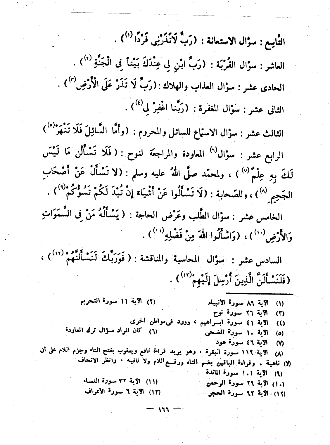 الرابع عشر: سؤال المعاودة والمراجعة لنوح: {فَلاَ تَسْئَلْنِ مَا لَيْسَ لَكَ بِهِ عِلْمٌ} ، ولمحمّد صلَّى اللهُ عليه وسلم: {لاَ تُسْأَلُ عَنْ أَصْحَابِ الجحيم} ، وللصّحابة: {لاَ تَسْأَلُواْ عَنْ أَشْيَآءَ إِن تُبْدَ لَكُمْ تَسُؤْكُمْ} .