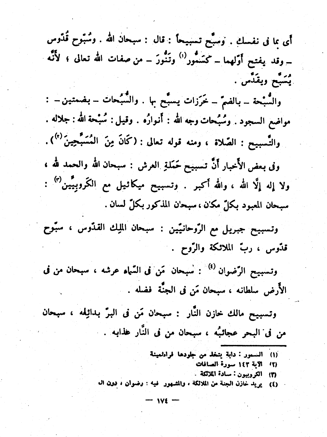 وفى بعض الأَخبار أَنَّ تسبيح حَمَلةِ العرش: سبحان الله والحمد لله، ولا إِله إِلاَّ الله، والله أَكبر. وتسبيح ميكائيل مع الكَروبِيِّين: سبحان المعبود بكلّ مكان، سبحان المذكور بكلّ لسان.