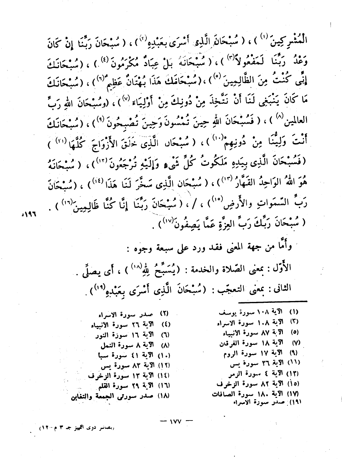 المشركين} ، {سُبْحَانَ الذي أسرى بِعَبْدِهِ} ، {سُبْحَانَ رَبِّنَآ إِن كَانَ وَعْدُ رَبِّنَا لَمَفْعُولاً} ، {سُبْحَانَهُ بَلْ عِبَادٌ مُّكْرَمُونَ} ، {سُبْحَانَكَ إِنِّي كُنتُ مِنَ الظالمين} ، {سُبْحَانَكَ هاذا بُهْتَانٌ عَظِيمٌ} ، {سُبْحَانَكَ مَا كَانَ يَنبَغِي لَنَآ أَن نَّتَّخِذَ مِن دُونِكَ مِنْ أَوْلِيَآءَ} ، {وَسُبْحَانَ الله رَبِّ العالمين} ، {فَسُبْحَانَ الله حِينَ تُمْسُونَ وَحِينَ تُصْبِحُونَ} ، {سُبْحَانَكَ أَنتَ وَلِيُّنَا مِن دُونِهِمْ} ، {سُبْحَانَ الذي خَلَق الأزواج كُلَّهَا} ، {فَسُبْحَانَ الذي بِيَدِهِ مَلَكُوتُ كُلِّ شَيْءٍ وَإِلَيْهِ تُرْجَعُونَ} ، {سُبْحَانَهُ هُوَ الله الواحد القهار} ، {سُبْحَانَ الذي سَخَّرَ لَنَا هاذا} ، {سُبْحَانَ رَبِّ السماوات والأرض} ، /، {سُبْحَانَ رَبِّنَآ إِنَّا كُنَّا ظَالِمِينَ} . {سُبْحَانَ رَبِّكَ رَبِّ العزة عَمَّا يَصِفُونَ} .